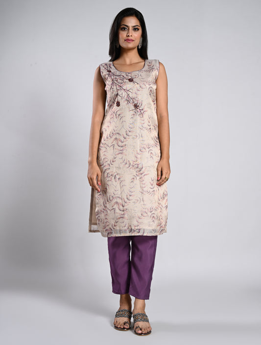 ivory and purple bead worked Printed shimmer straight cut set with cotton straight pants and purple dupatta