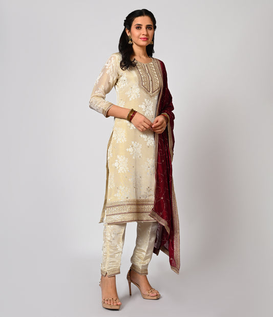 Elegant Half White Jacquard Straight Cut Set with Contrast Dupatta