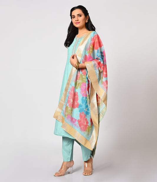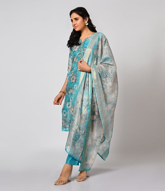 Floral Blue Digital Printed Straight Cut Salwar Kameez Set with Dupatta