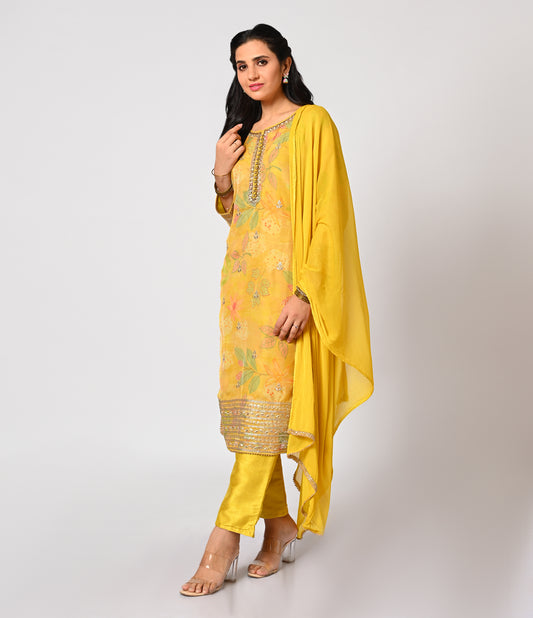 Printed Yellow Crepe Straight Cut Set with Dupatta
