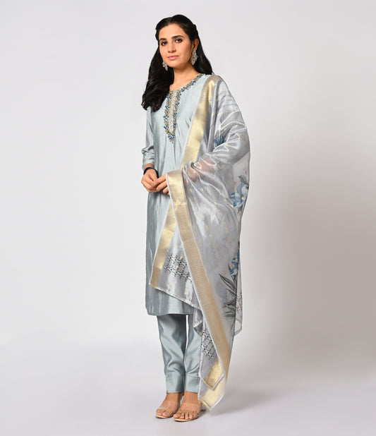 Elegant Grey Straight Cut Set with Contrast Printed Dupatta