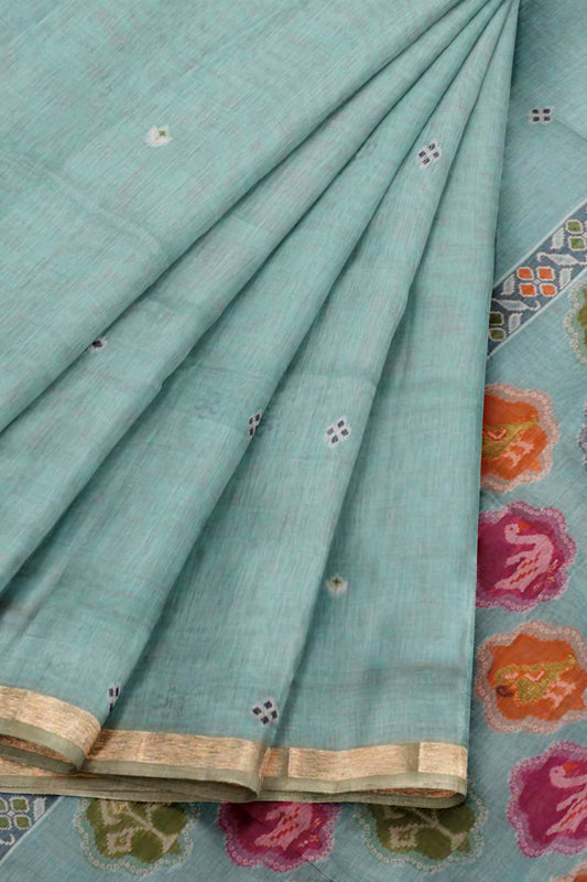 Blue Green Soft Bengal Cotton Zari Border Swan Emblem Saree