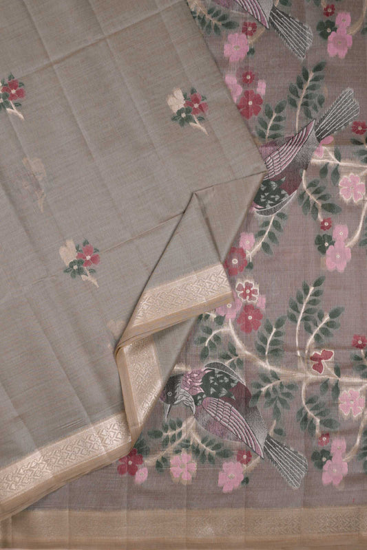 Dark Grey Soft Bengal Cotton Bird Trail Pallu Saree