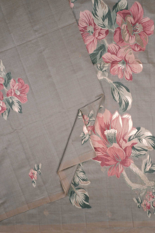 Dark Grey Soft Bengal Cotton Lush Bloom Saree