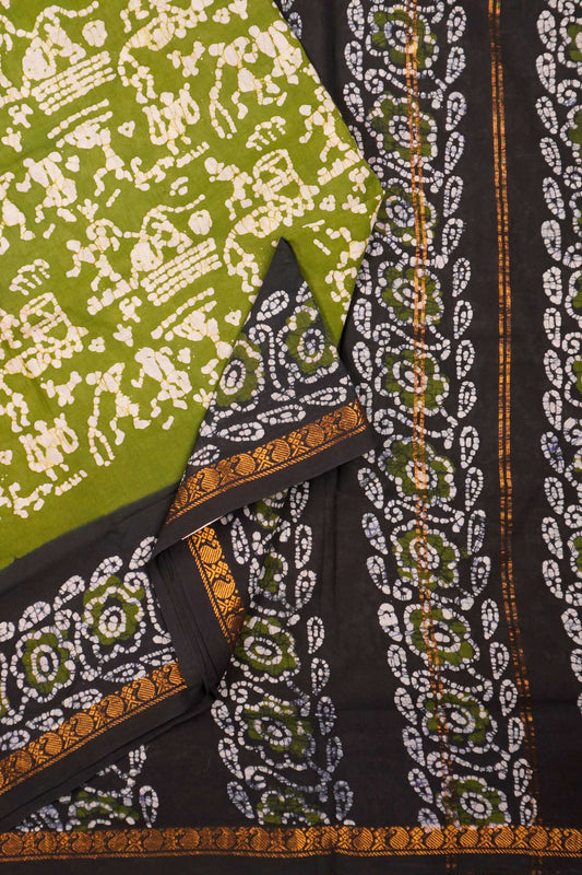 Olive Green Pure Sungudi Cotton Warli Style Print Zari Border Saree