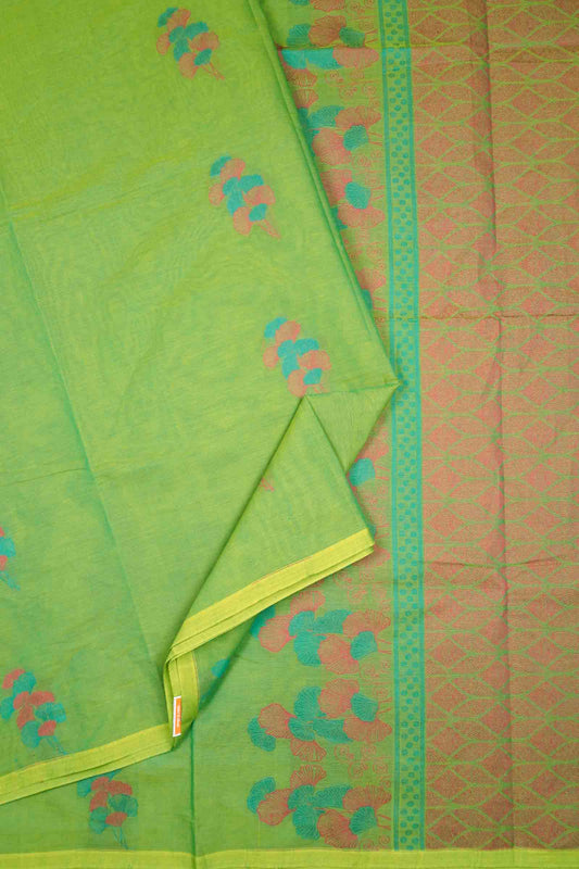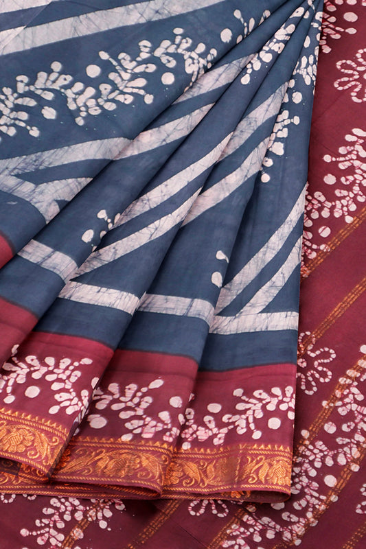 Grey Pure Sungudi Cotton Fancy Cross Floral Vines Print Zari Border Saree