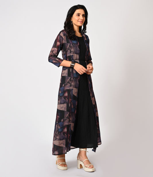 Black Western Gown with Digital Print Overcoat