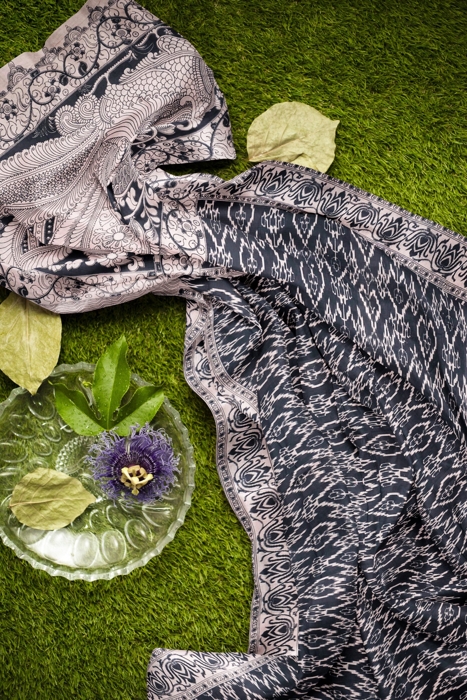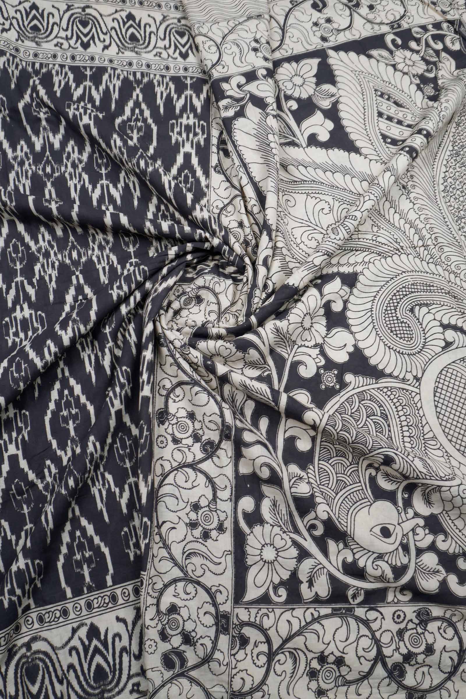 Black Kalamkari Pure Cotton Ikkat Style Print Peacock Pallu Saree