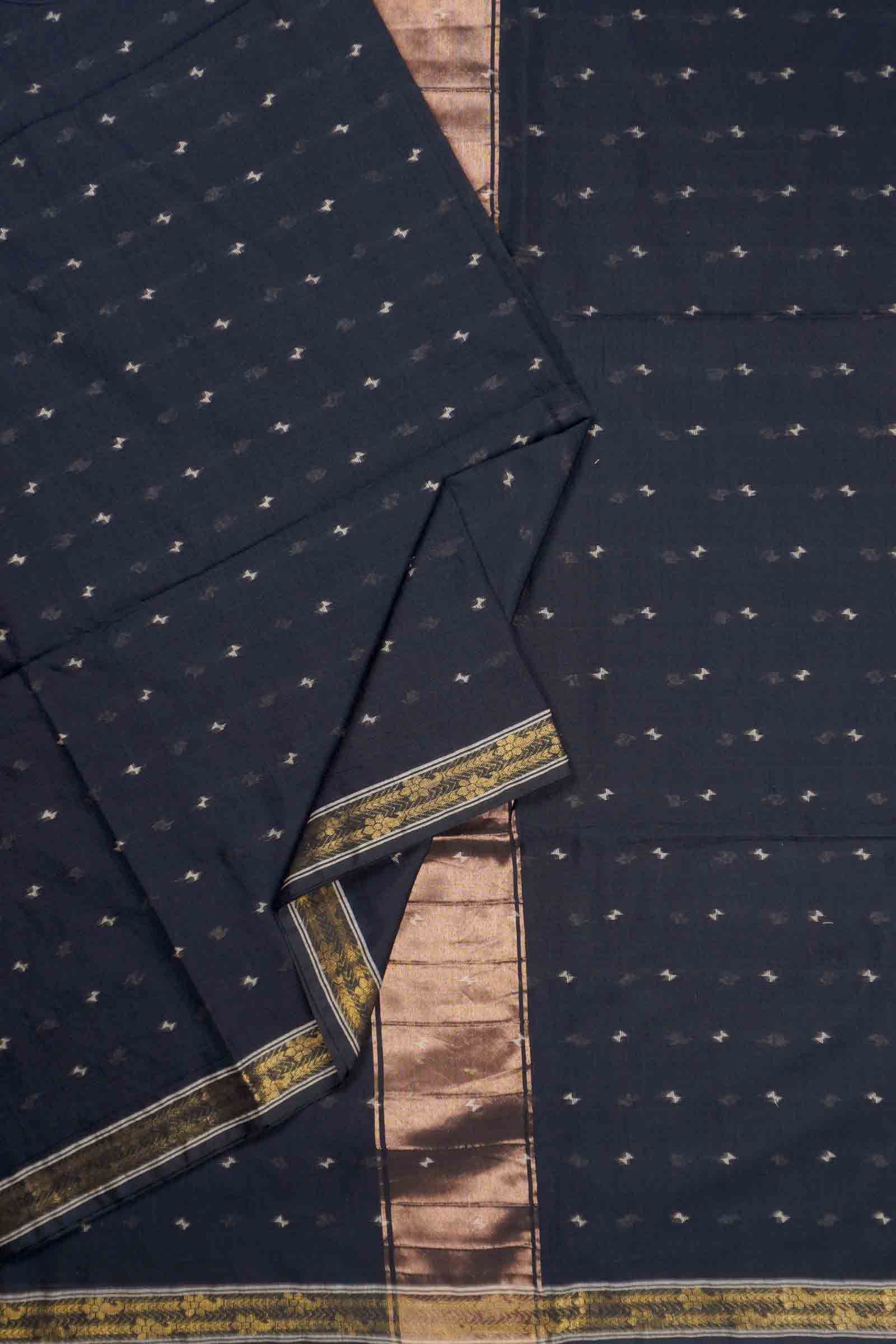 Black Soft Bengal Cotton Mini Butta Block Zari Pallu Saree