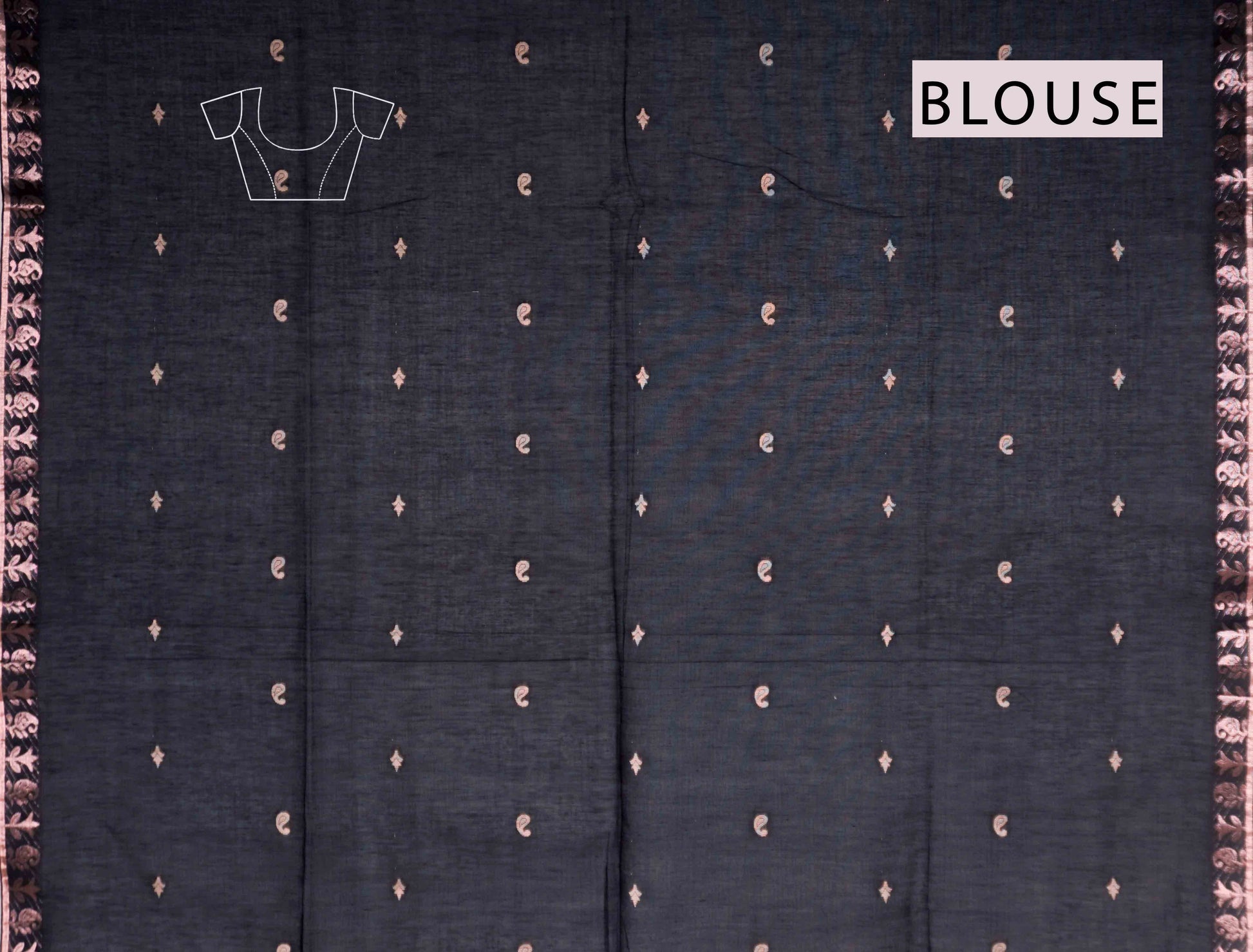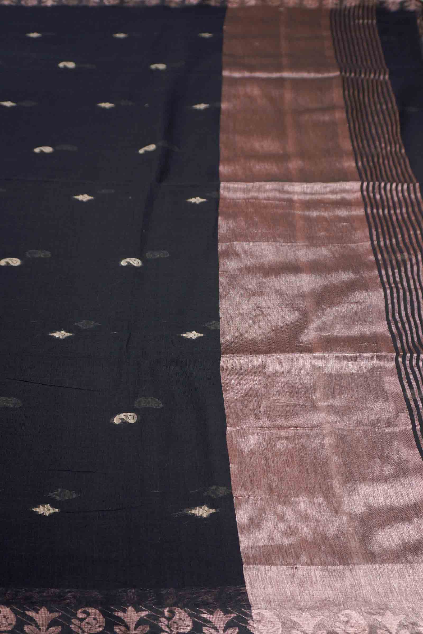 Black Soft Bengal Cotton Mini Cocoa Butta Block Zari Pallu Saree