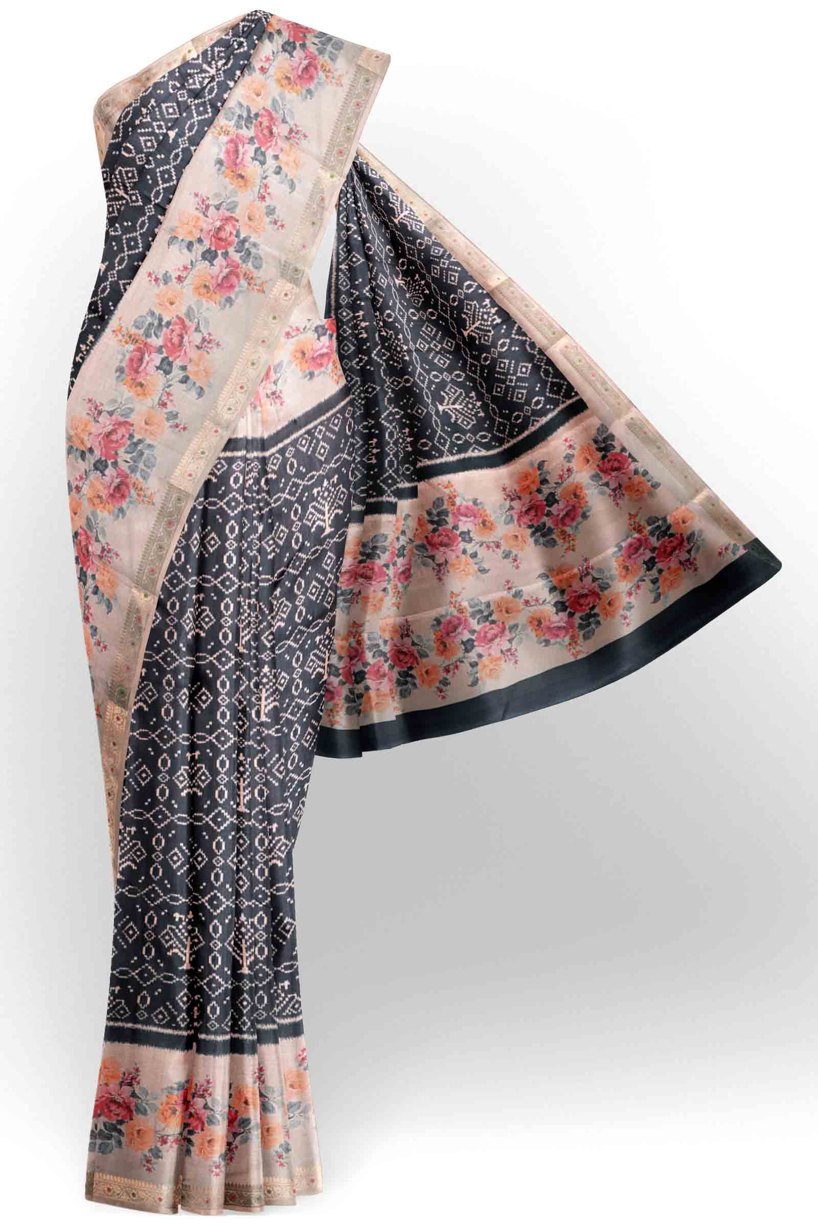Black Printed Rangoli Print Floral Border Saree NAA234