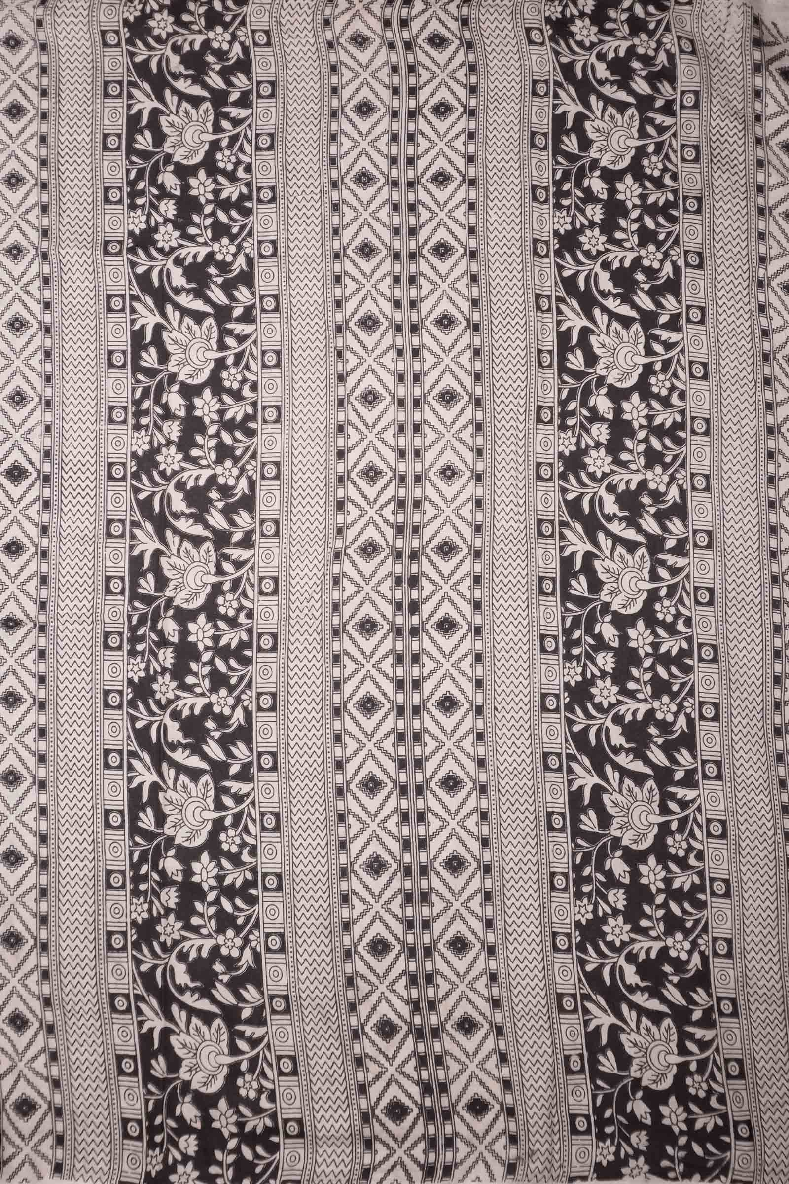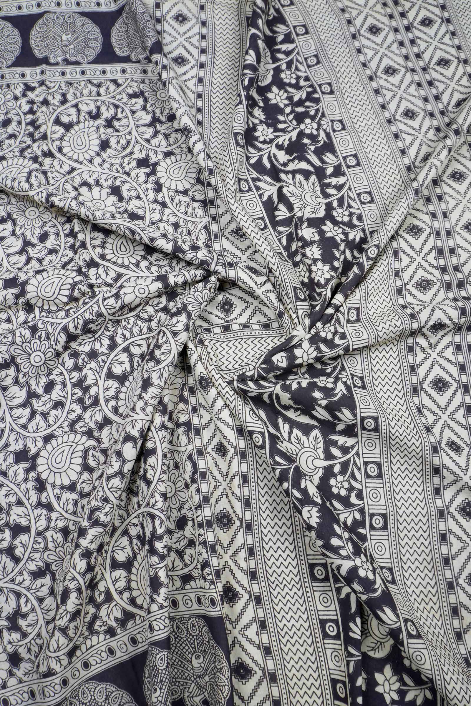 Black Kalamkari Pure Cotton Floral Print Peacock Border Saree