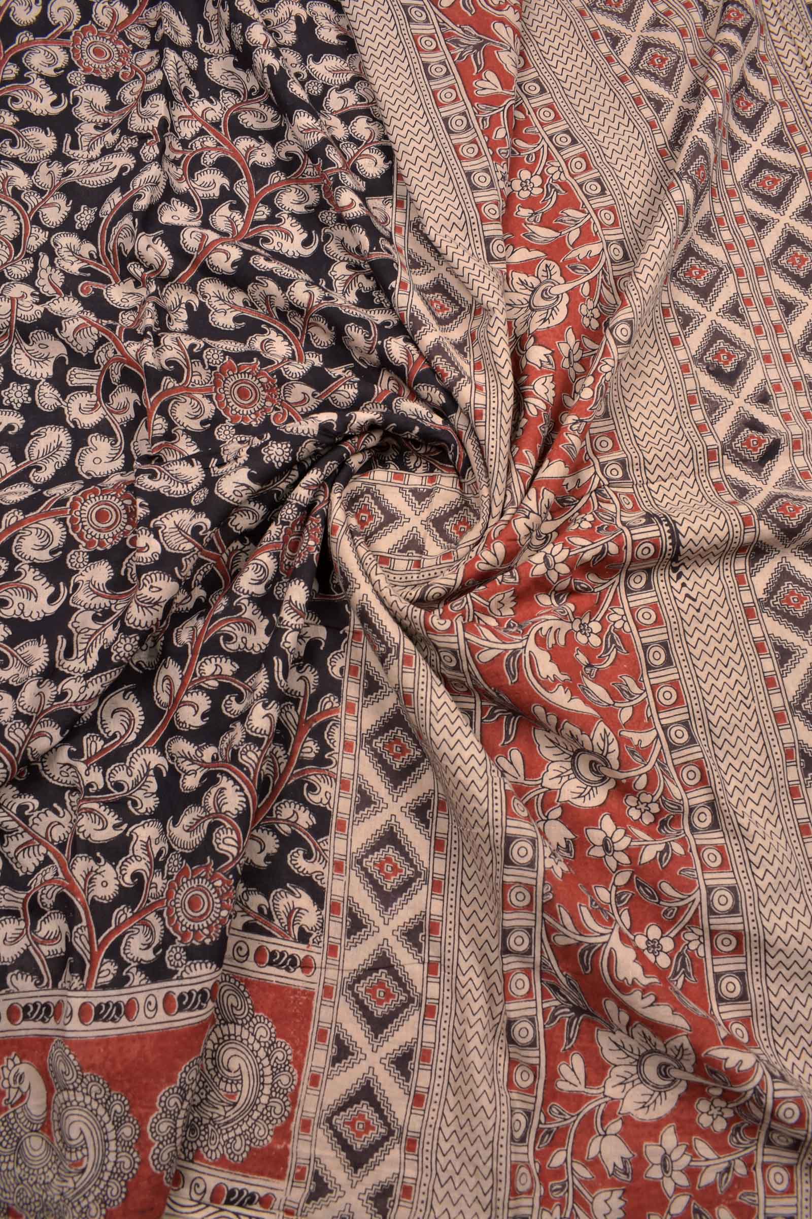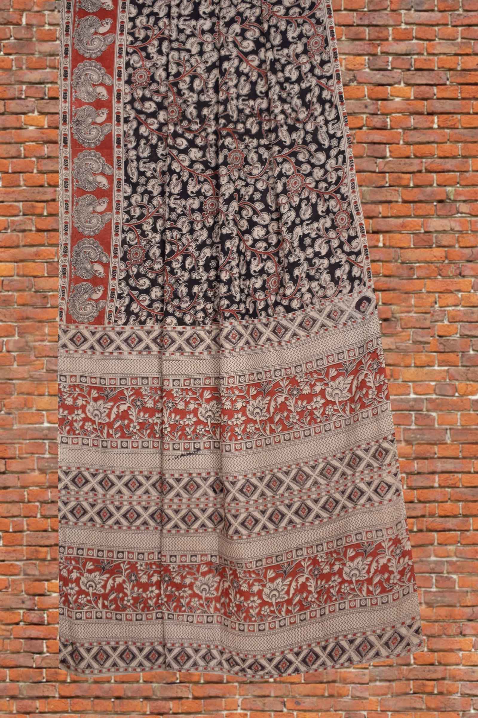 Black Kalamkari Pure Cotton Crimson Garden Printed Peacock Border Saree