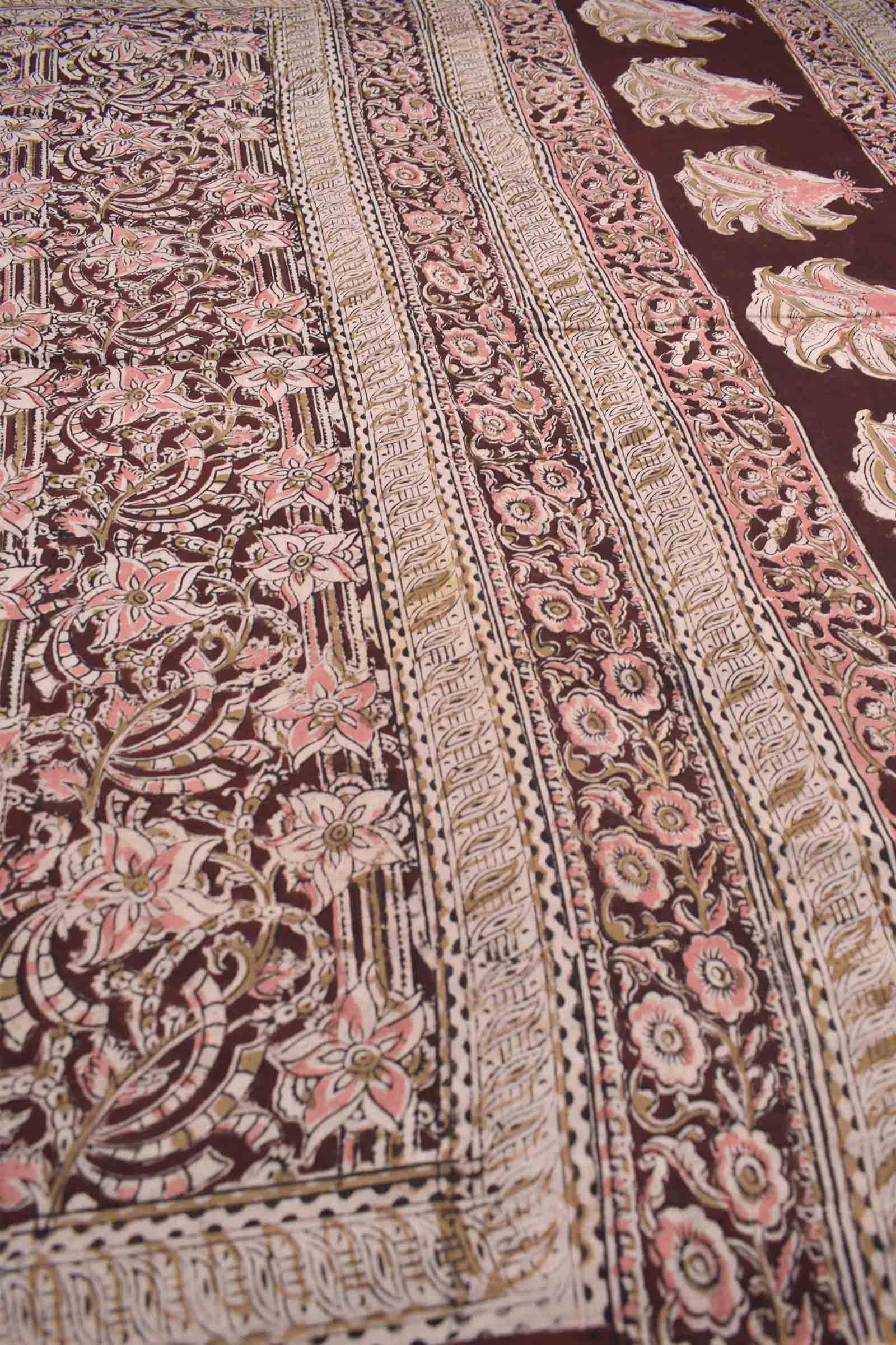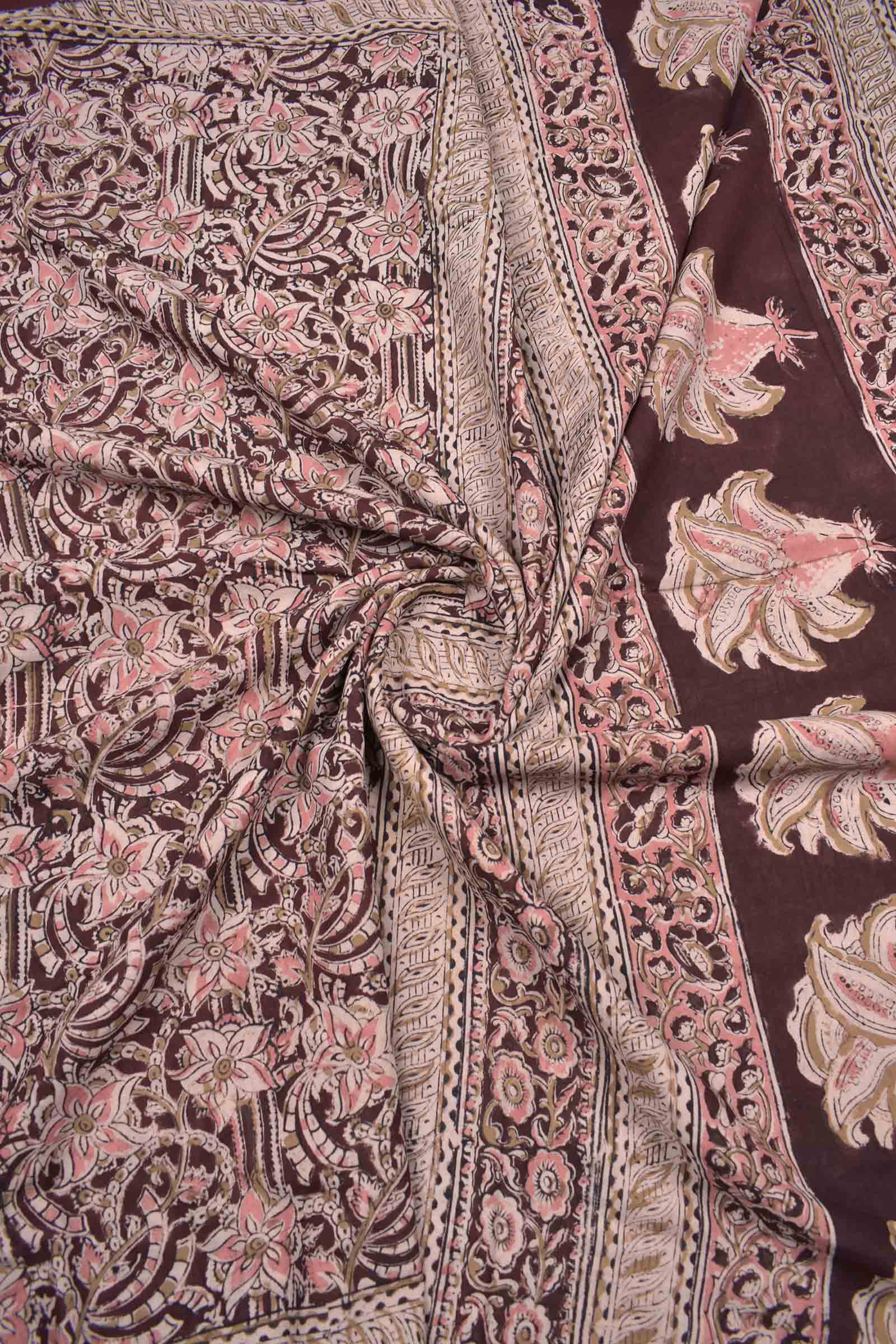 Dark Maroon Kalamkari Pure Cotton Pretty Peach Floral Printed Saree