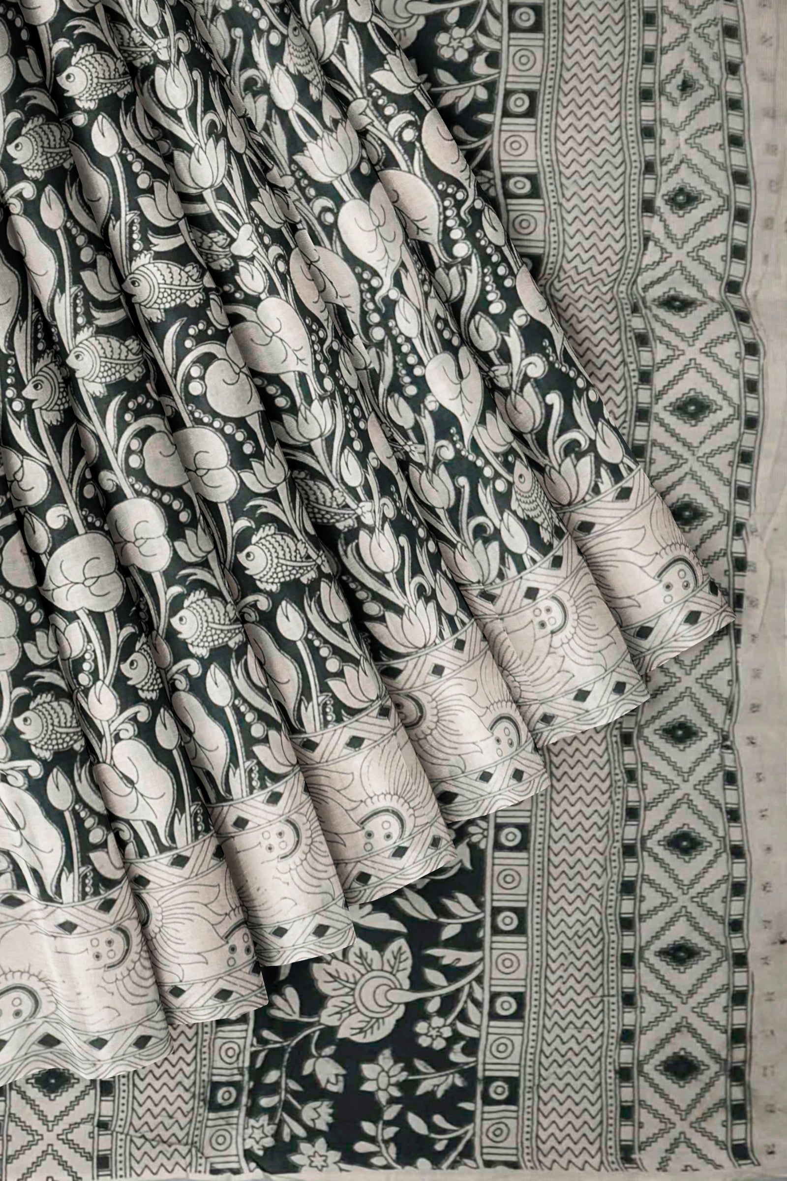 Black Kalamkari Pure Cotton Floral Scenes Print Saree
