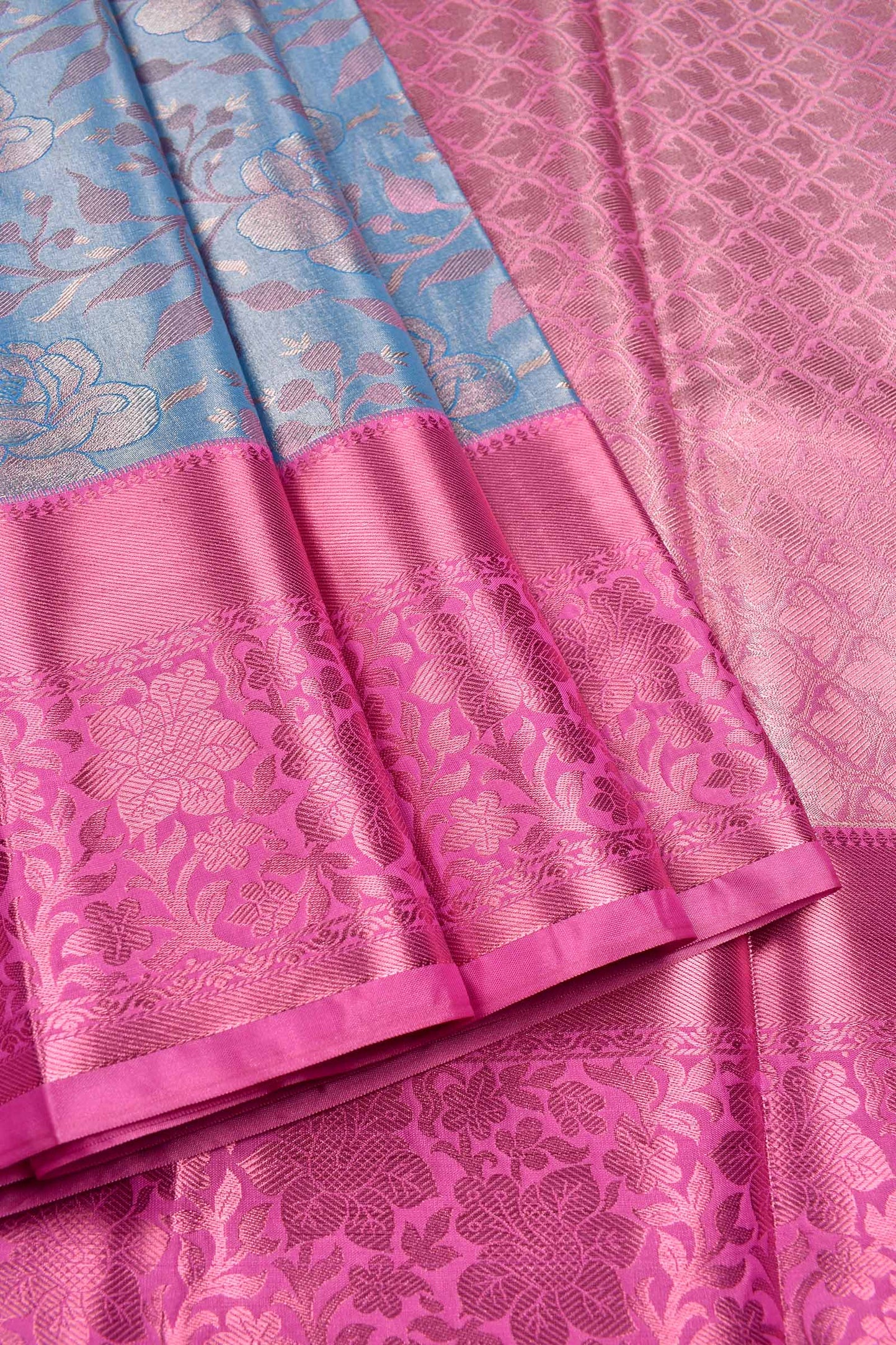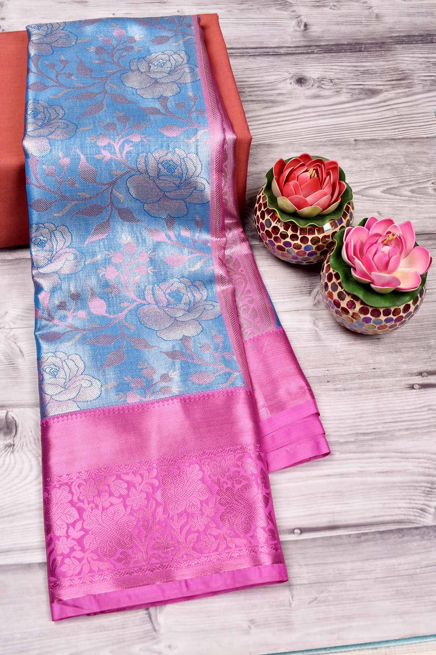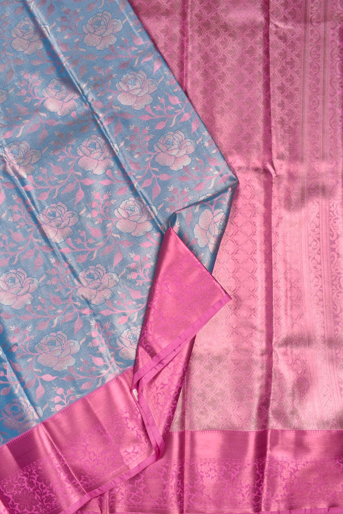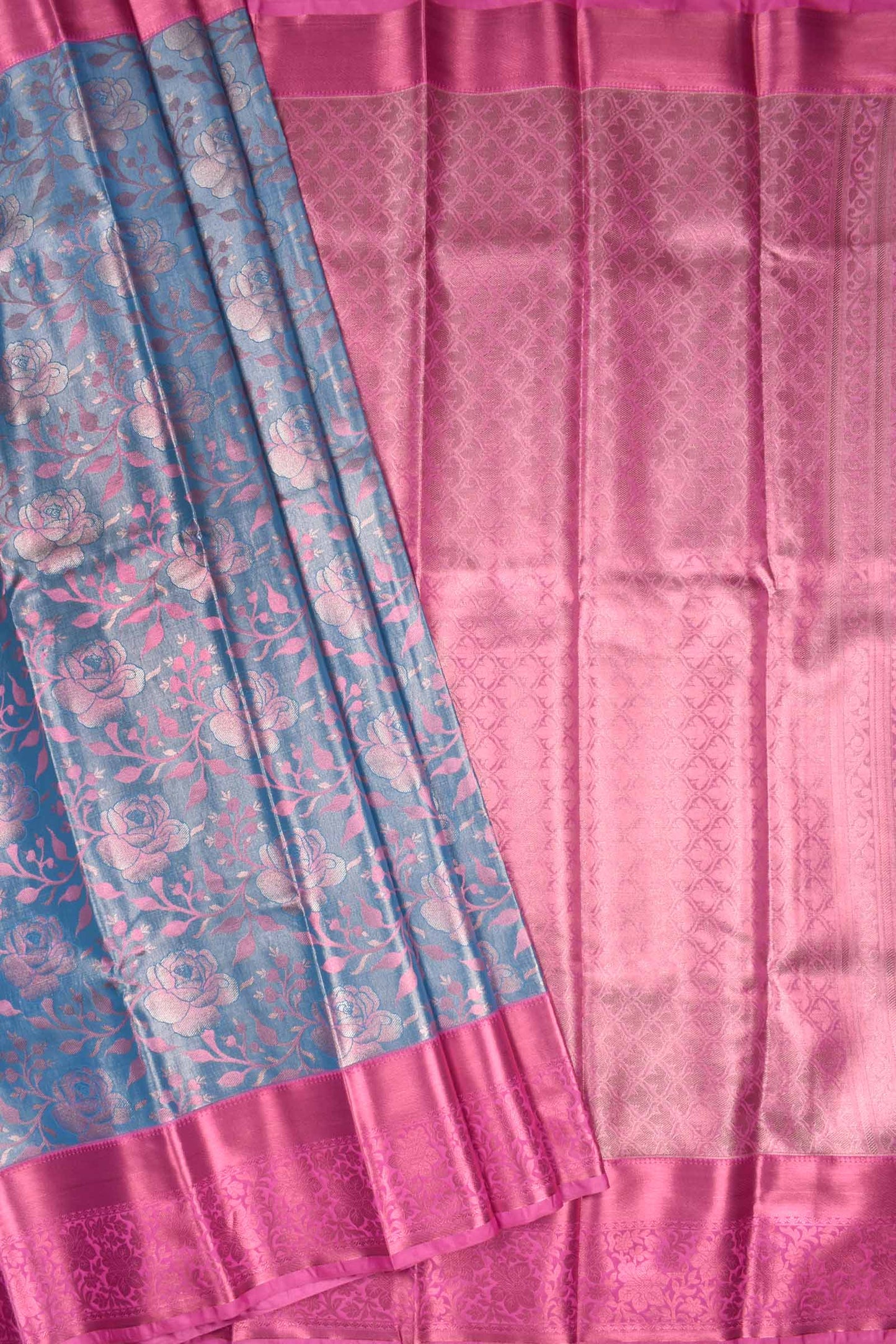 Sky Blue Semi Silk Rose Jacquard Contrast Pink Border Bridal Tissue Saree
