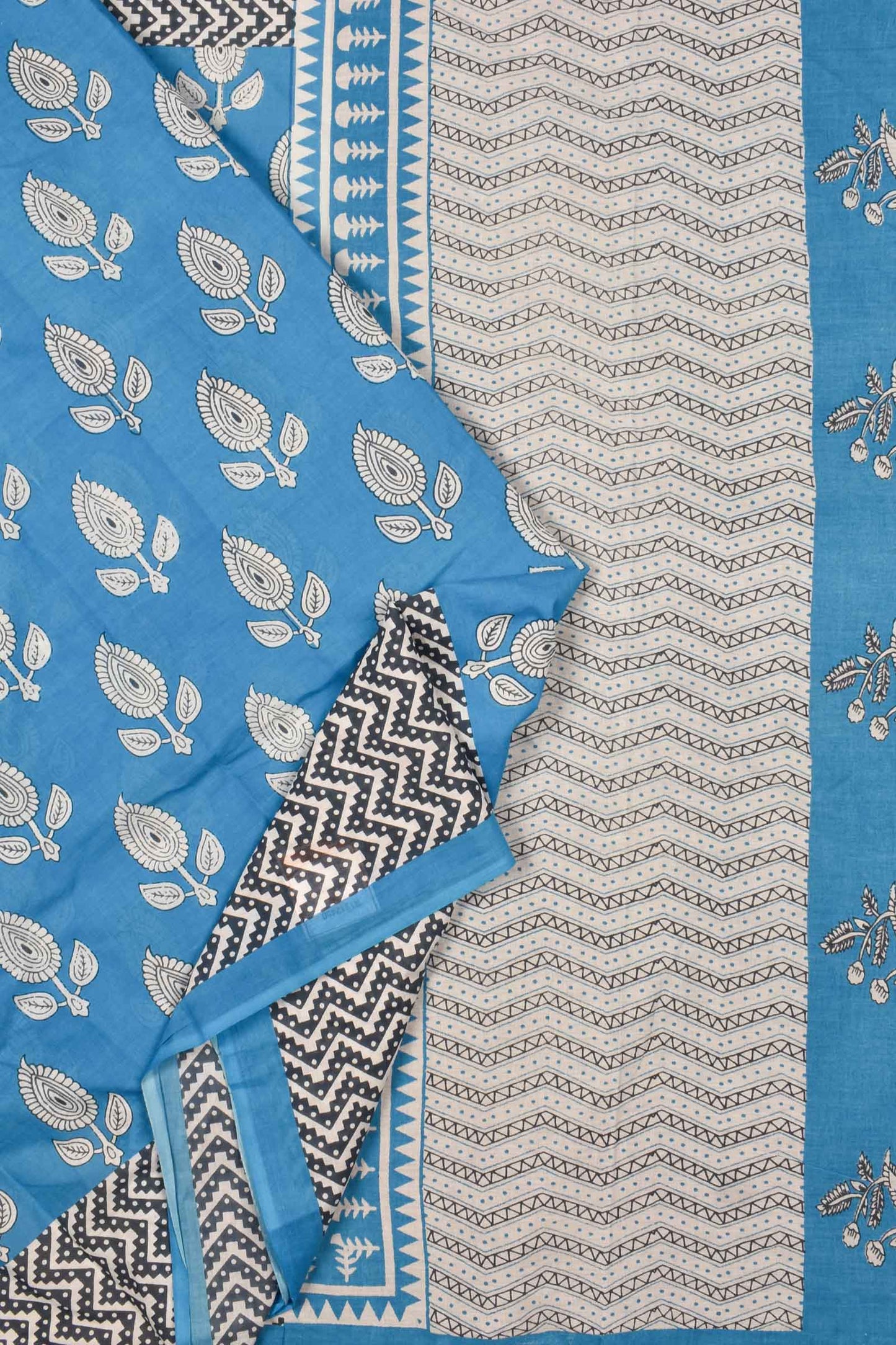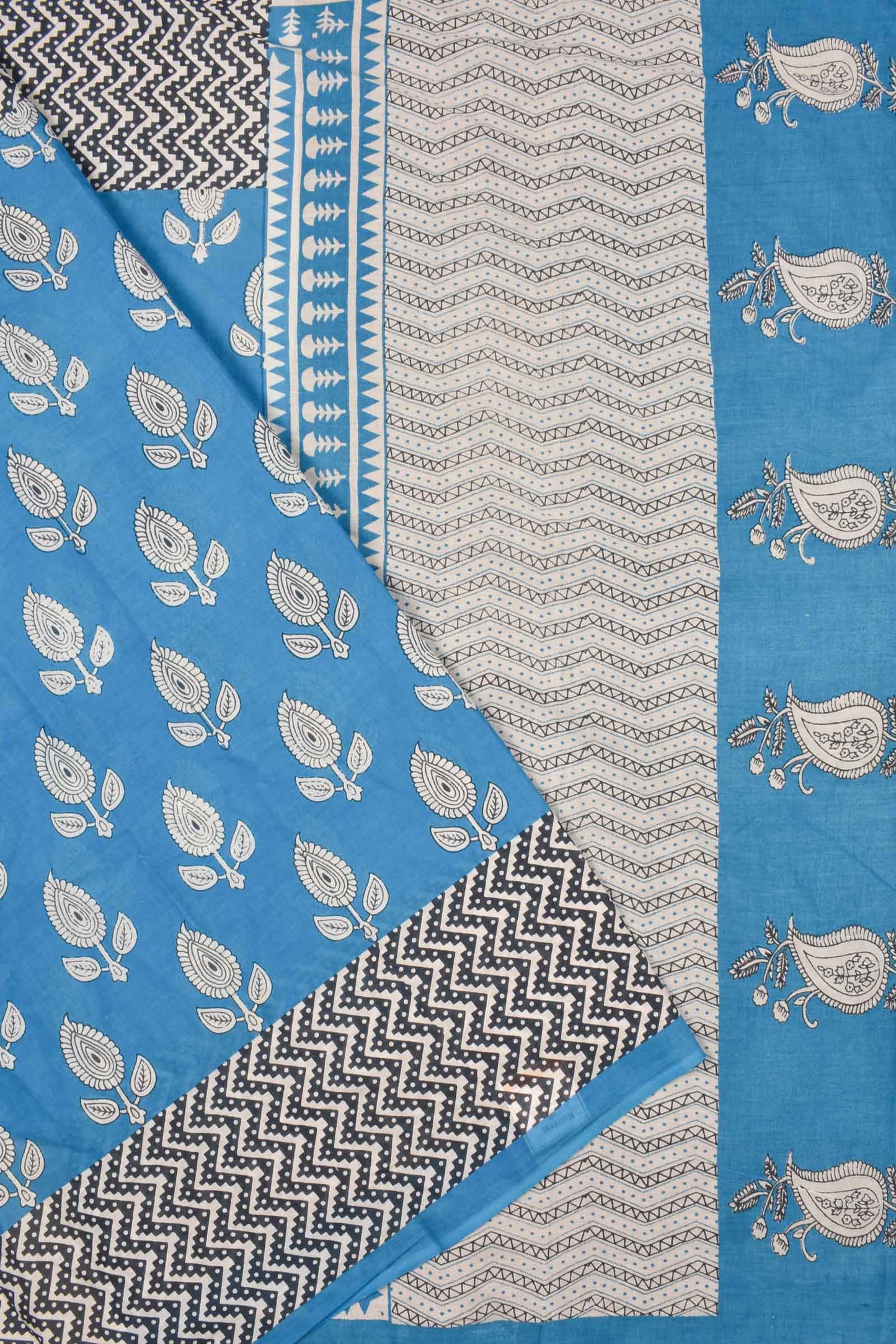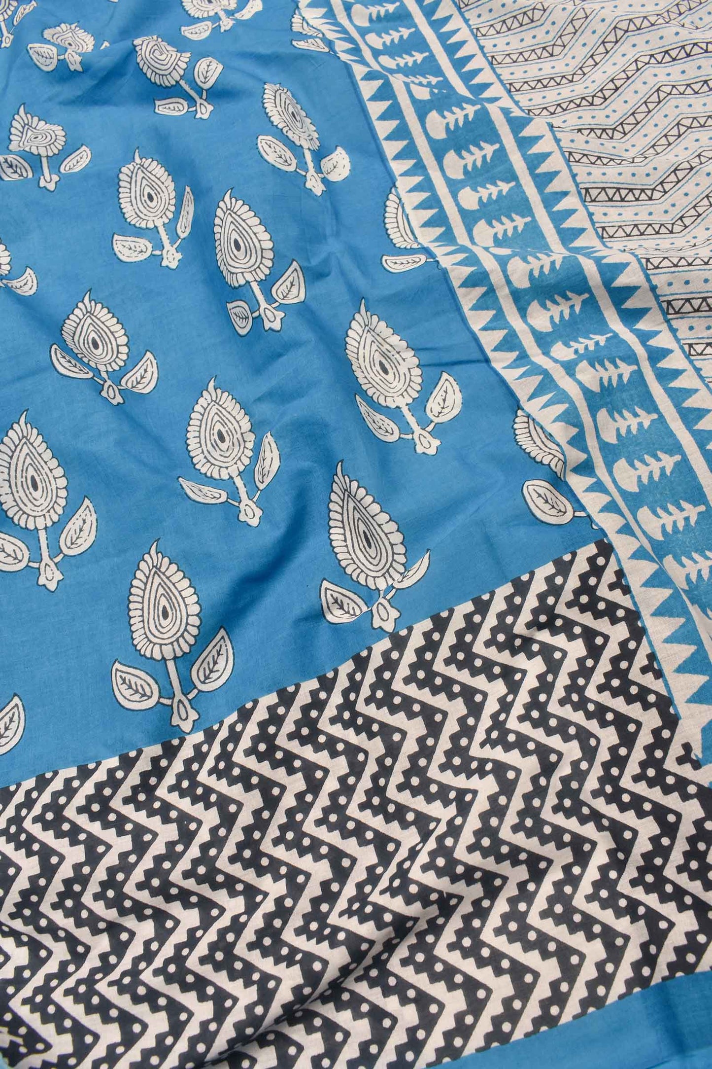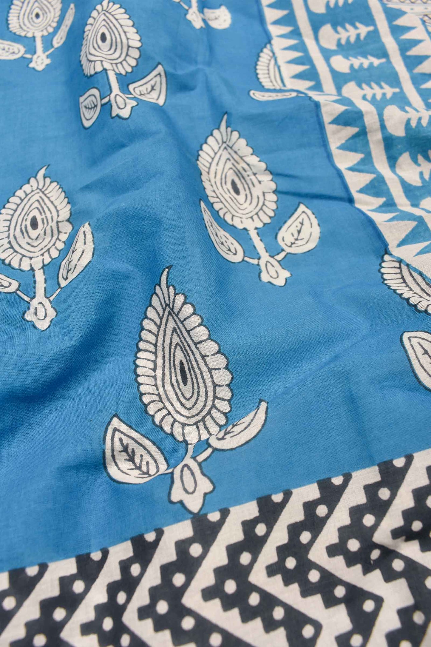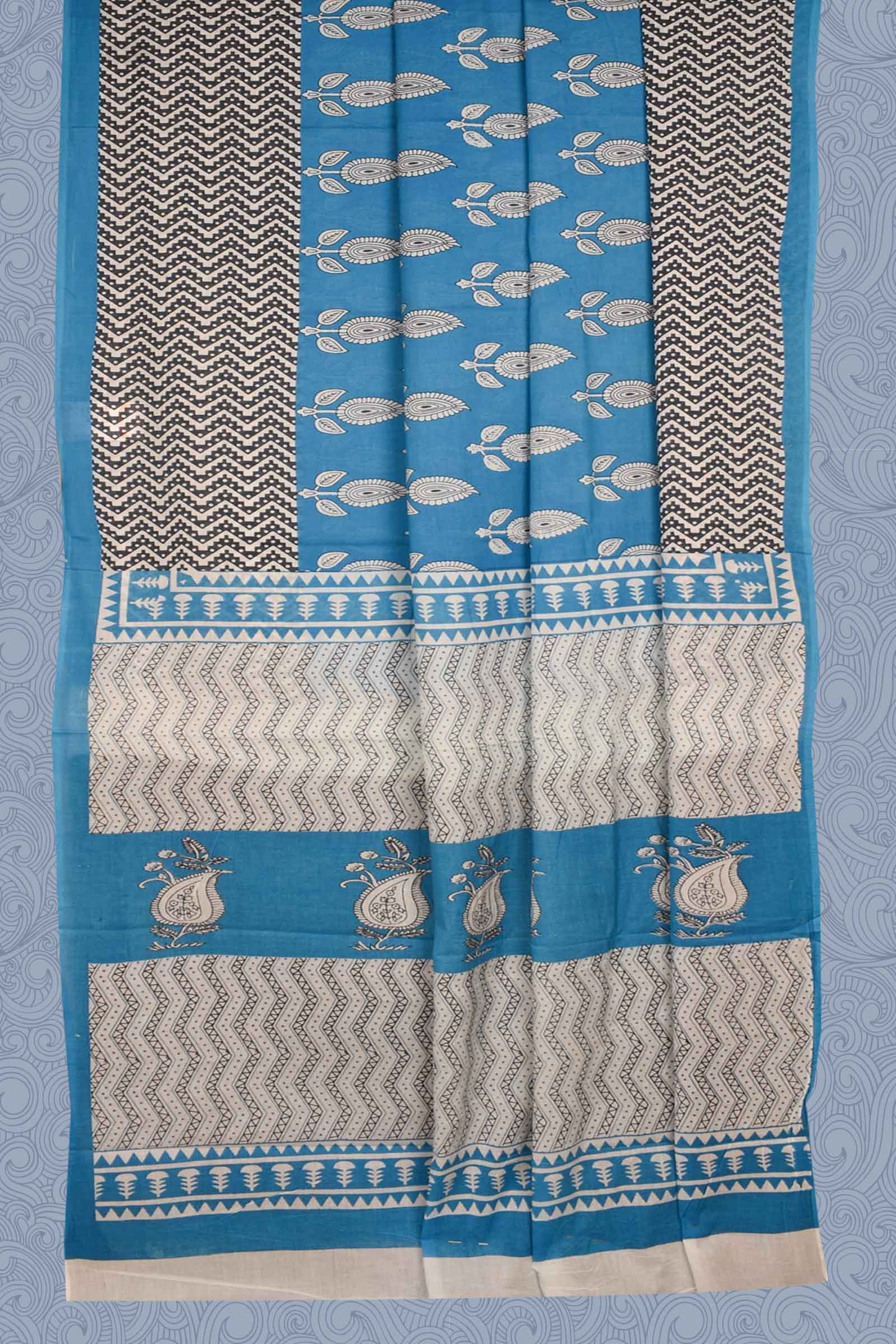 Blue Pure Cotton Mul Mul ZigZag Border Printed Saree