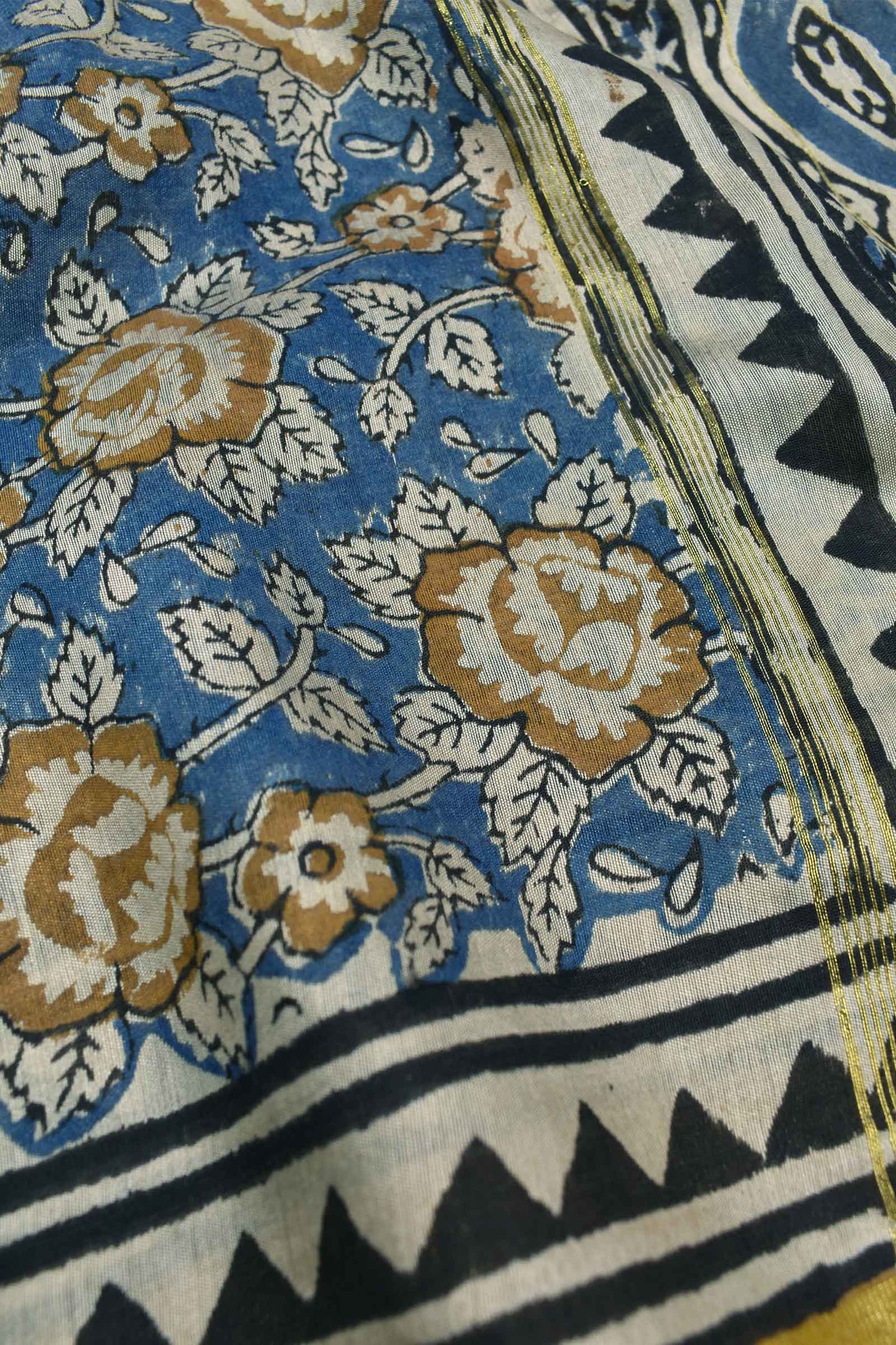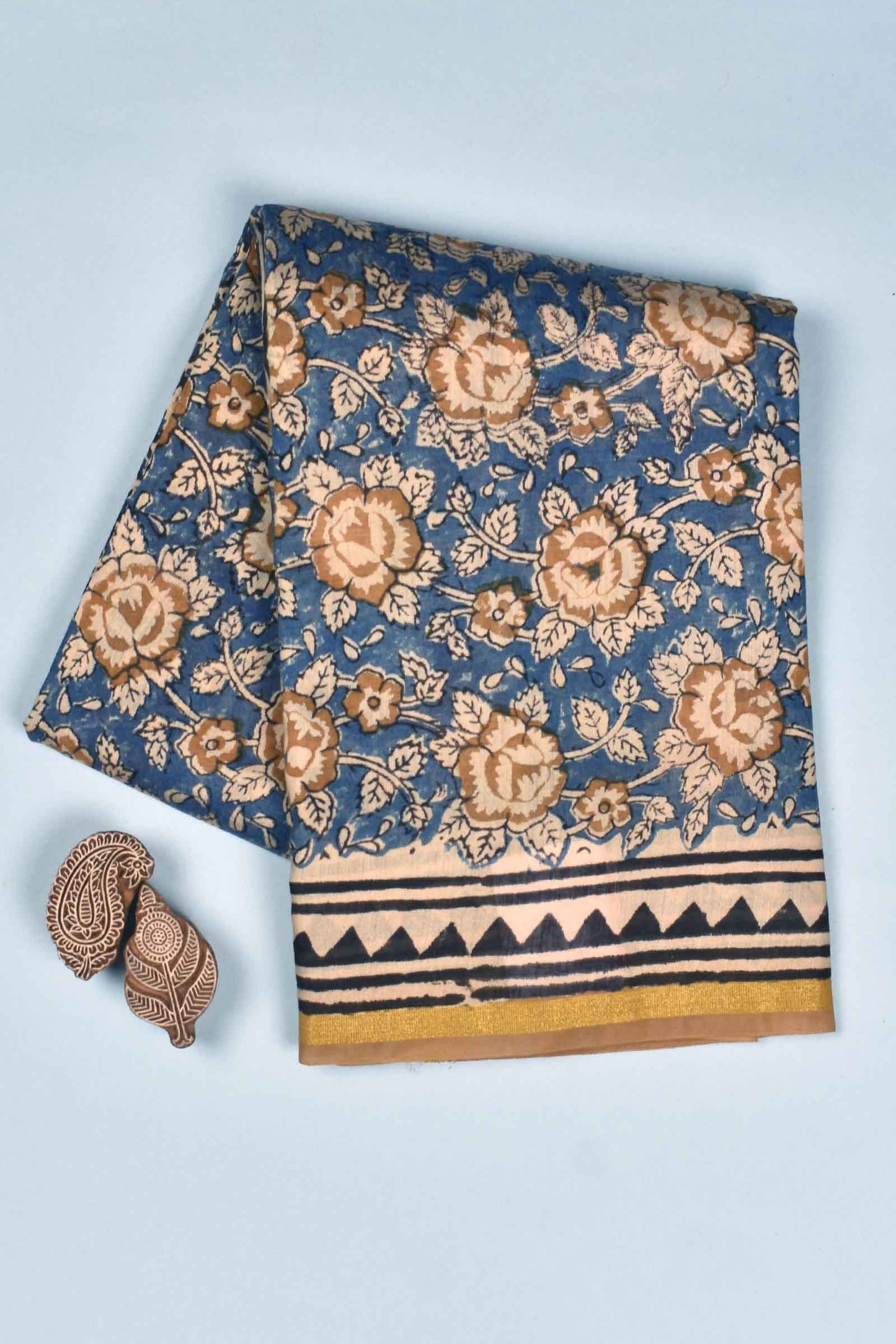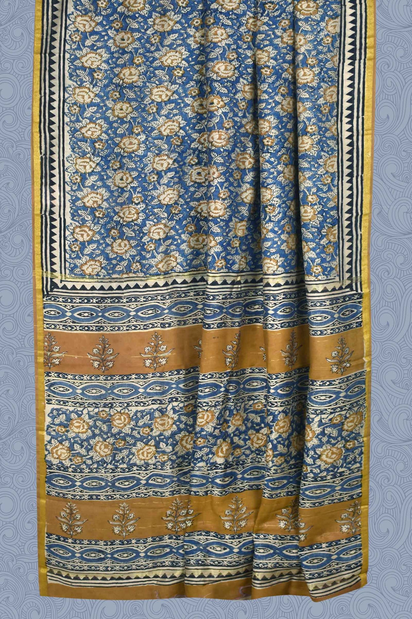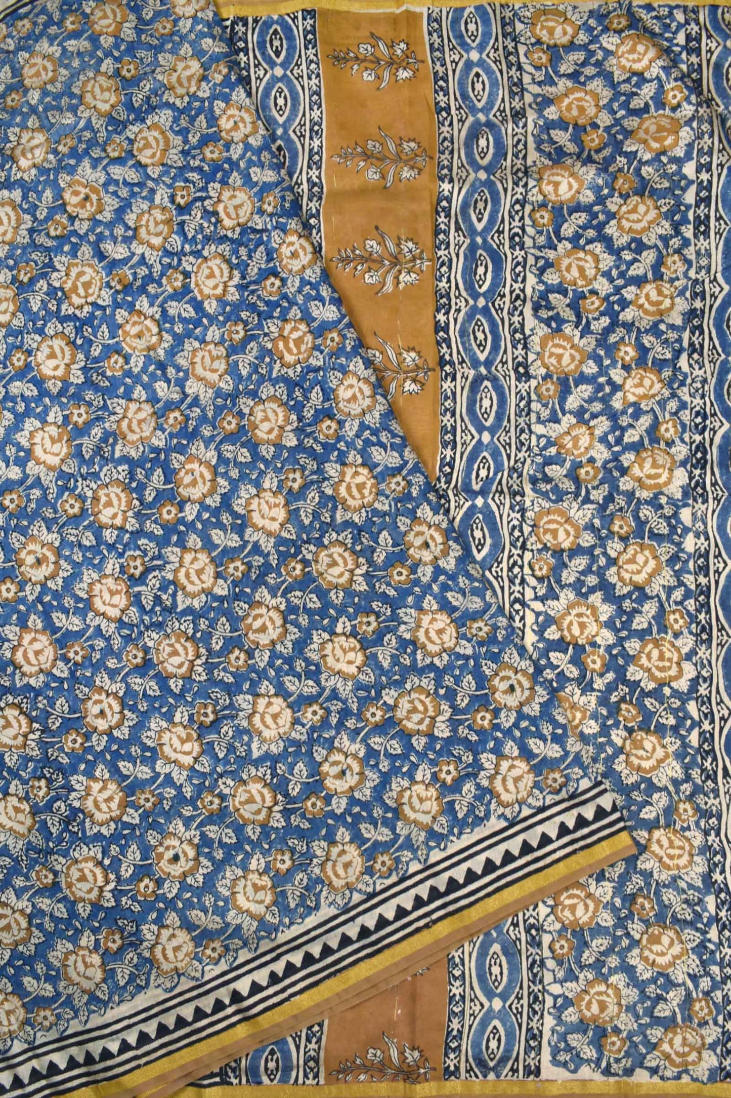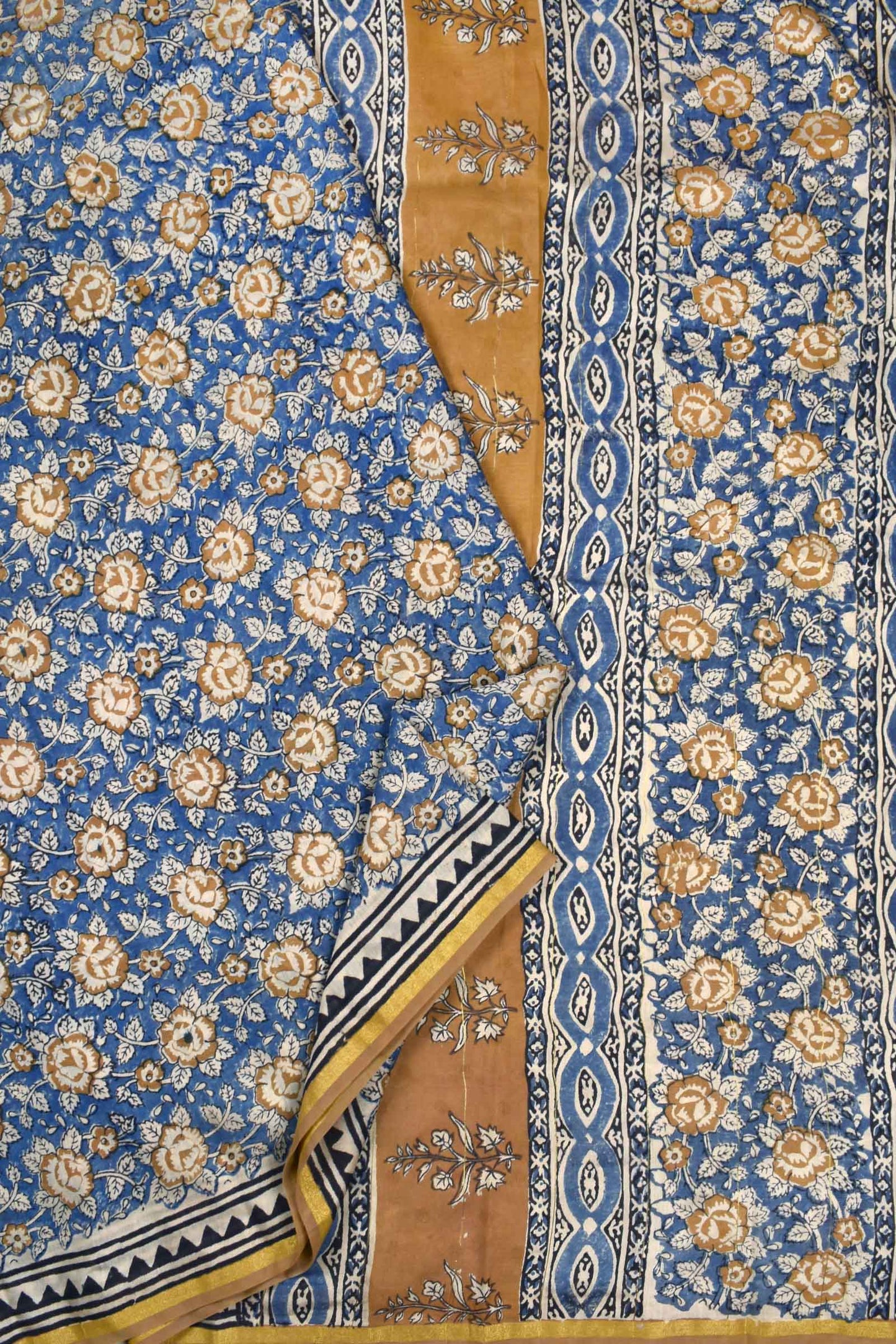 Blue Chanderi Cotton Beige Rose HandBlock Printed Saree