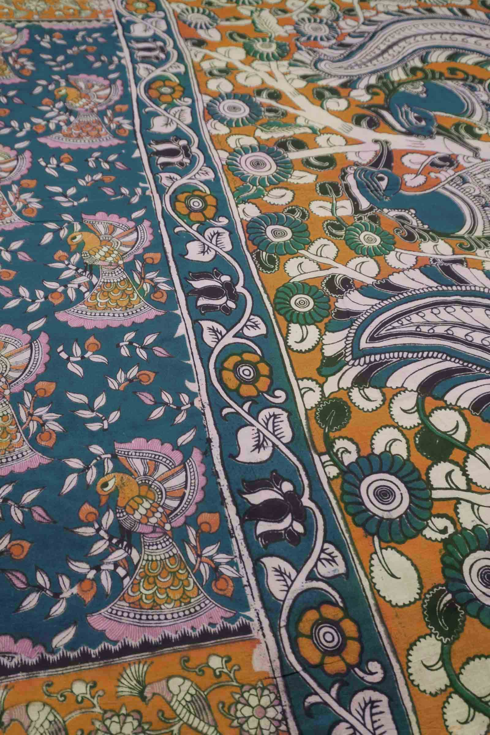 Blue Kalamkari Pure Cotton Floral Dancing Peacock Saree