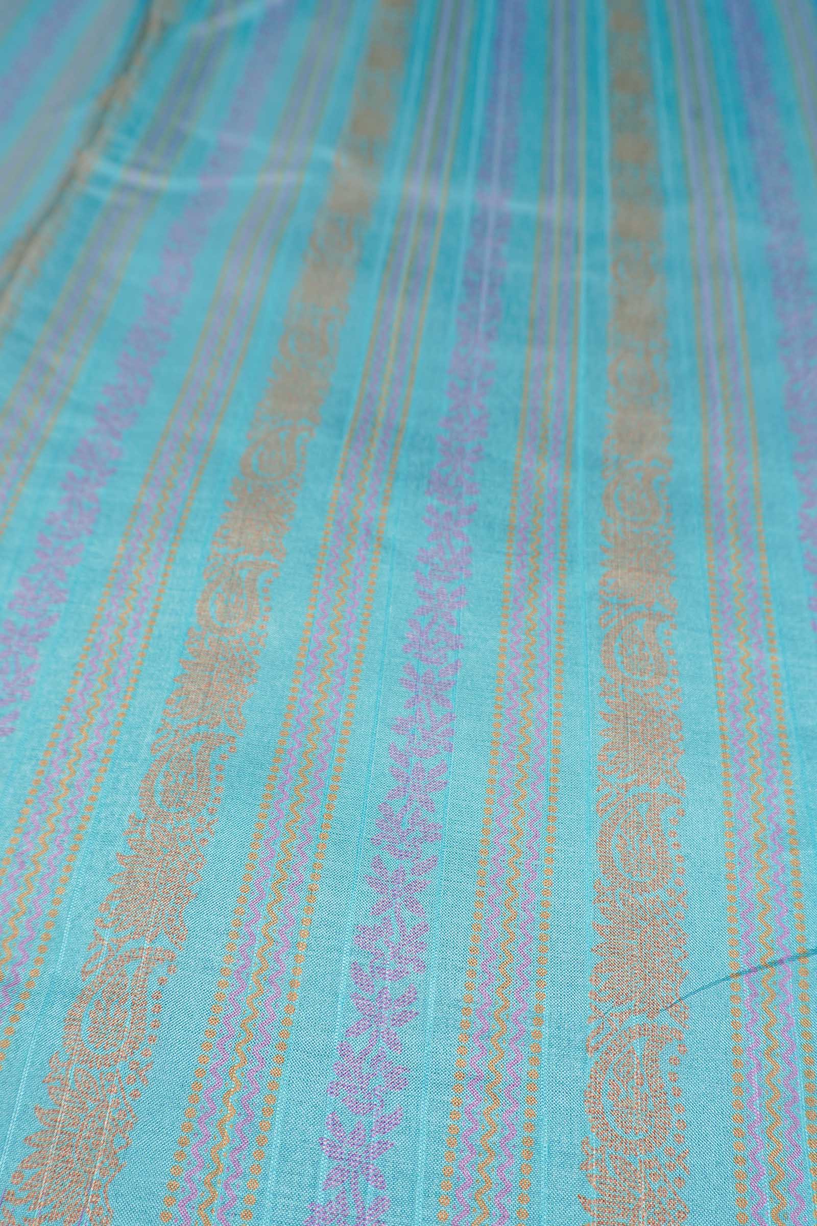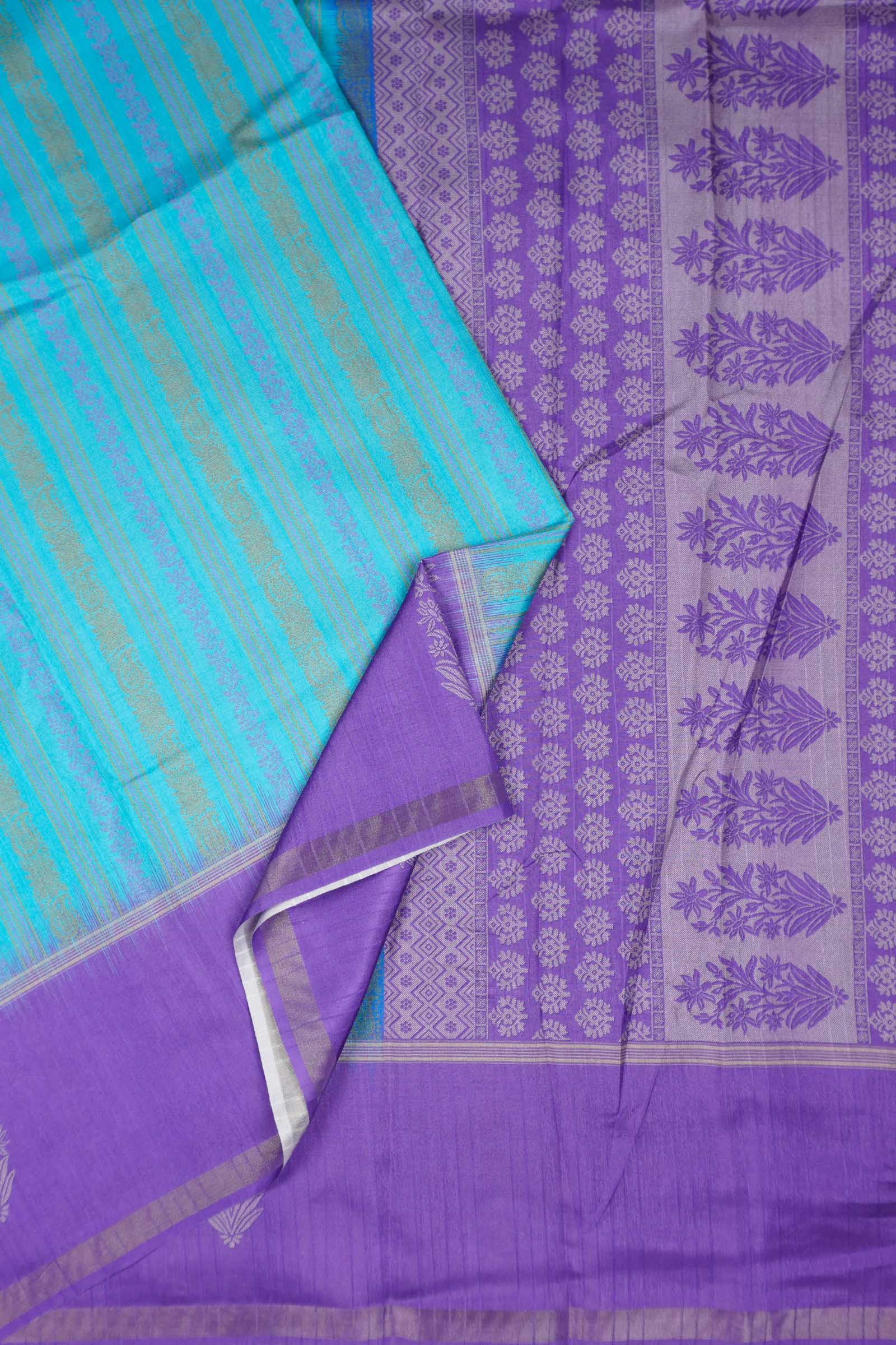 Blue Printed Cotton Zari Lines Butta Contrast Border Saree