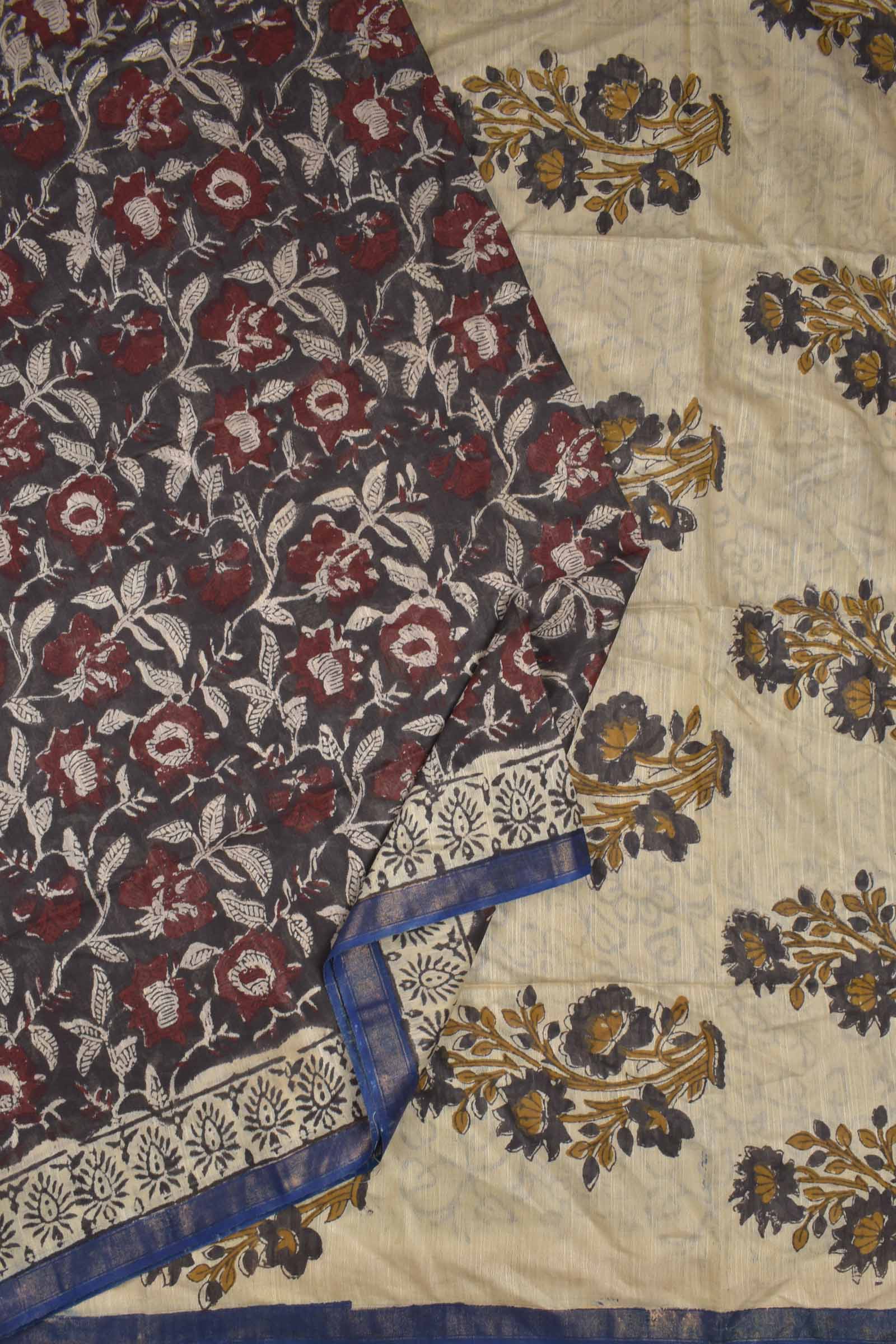 Brown Bengal Cotton Floral Kalamkari Style Zari Border Saree