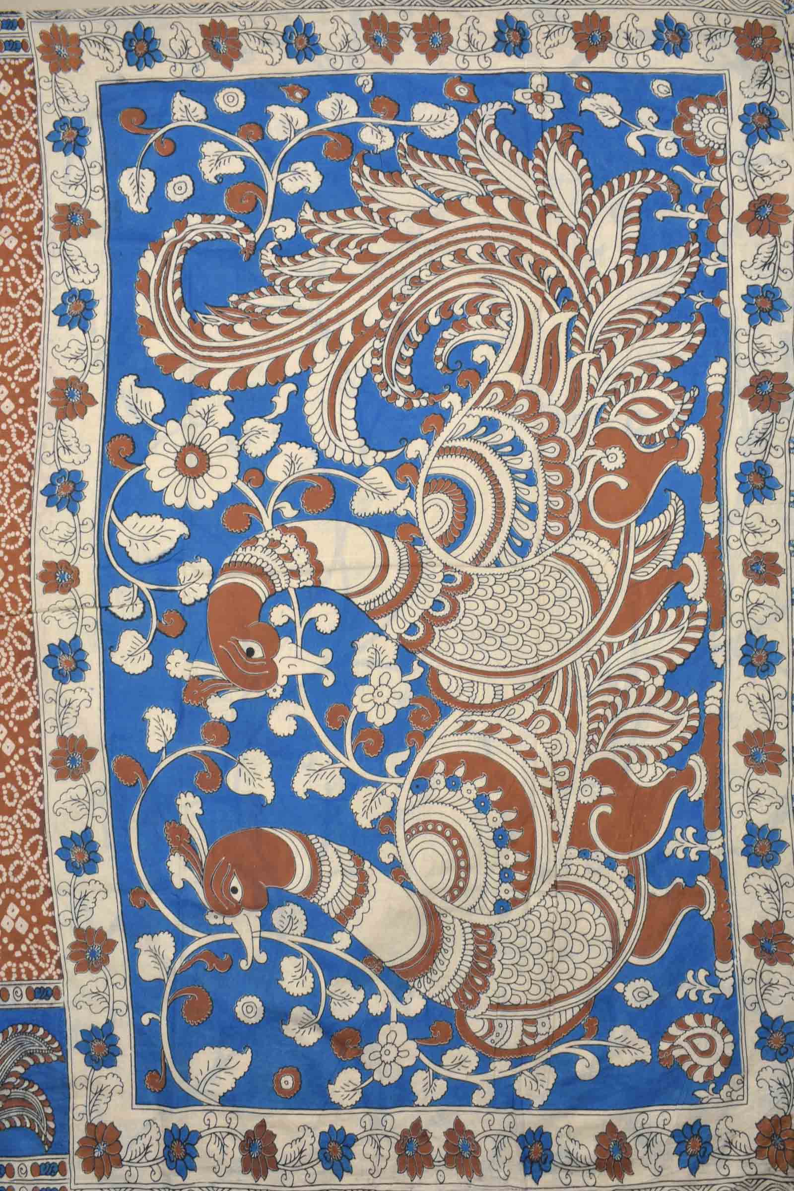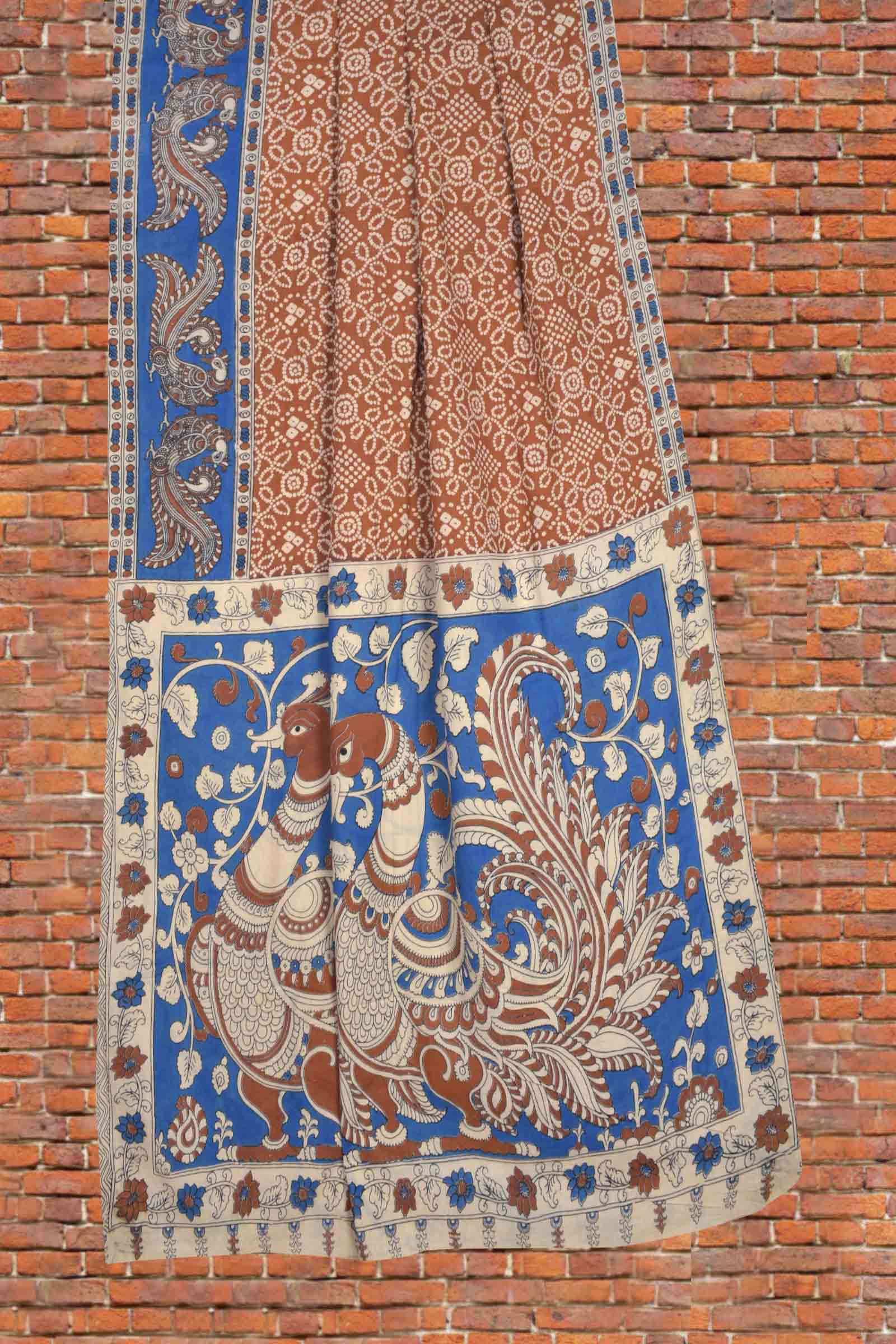 Brown Kalamkari Pure Cotton Rangoli Kolam Print Peacock Border Pallu Saree