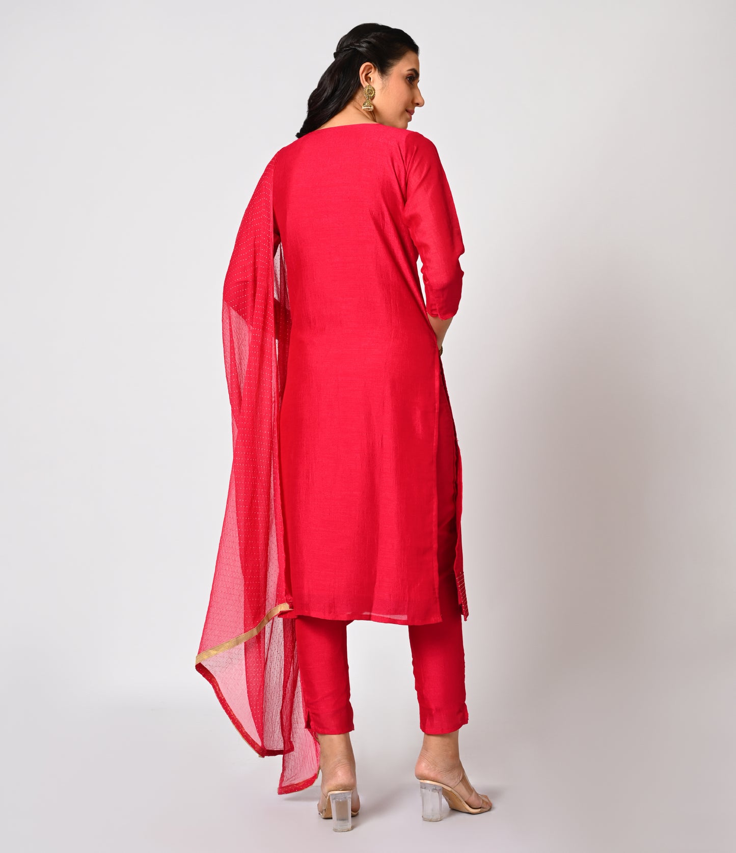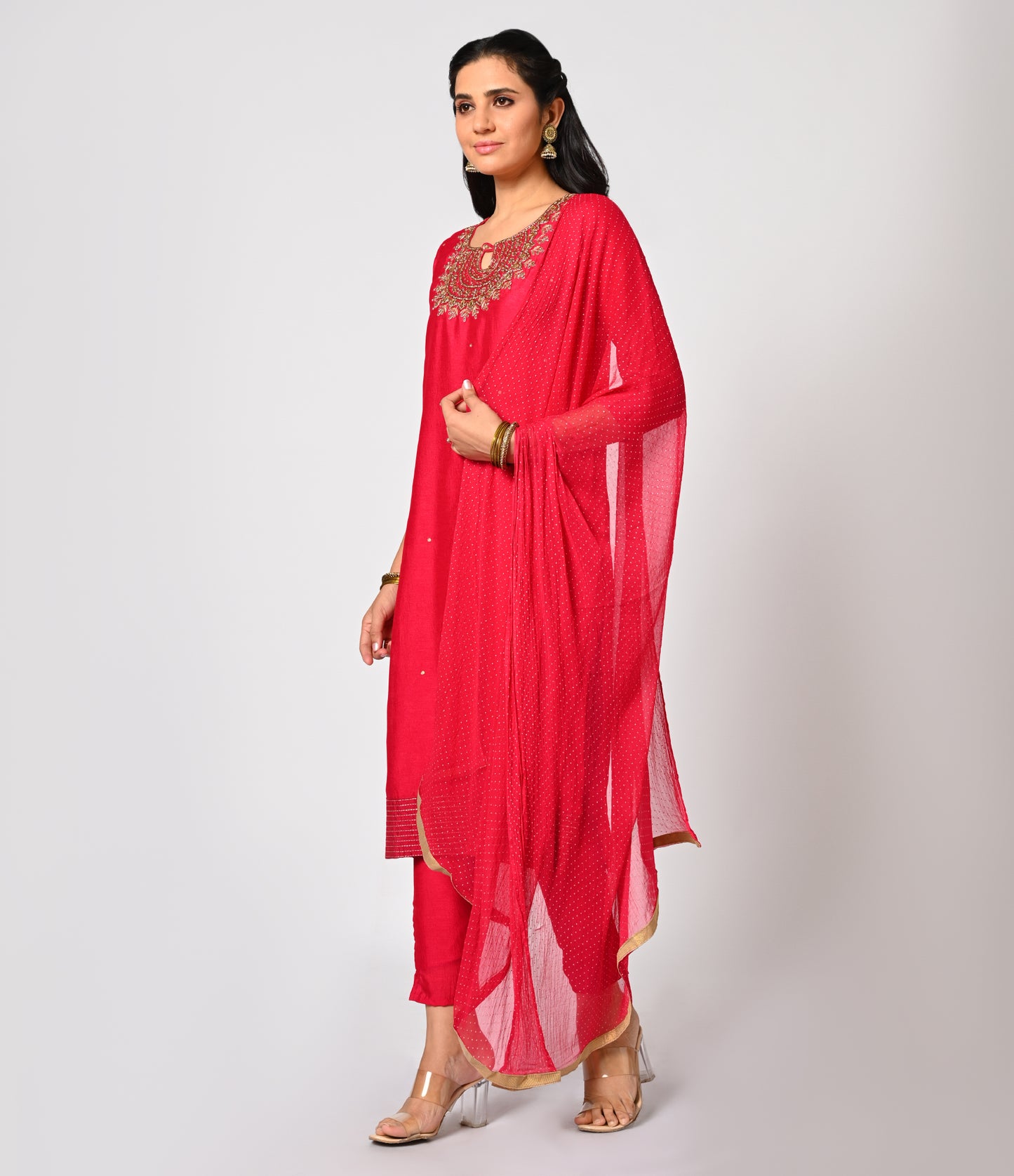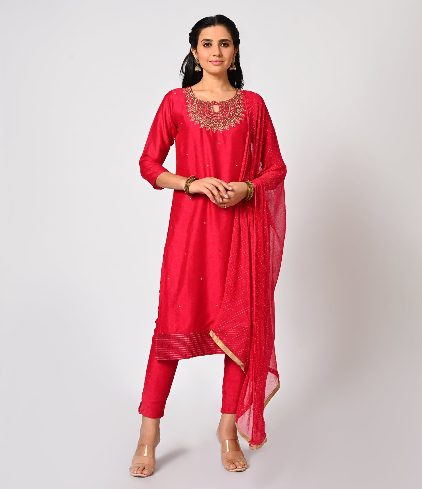 Rani pink straight cut kurti with golden stone and zari work on neckline, mirror buttis all over top, round neck, elbow sleeves.