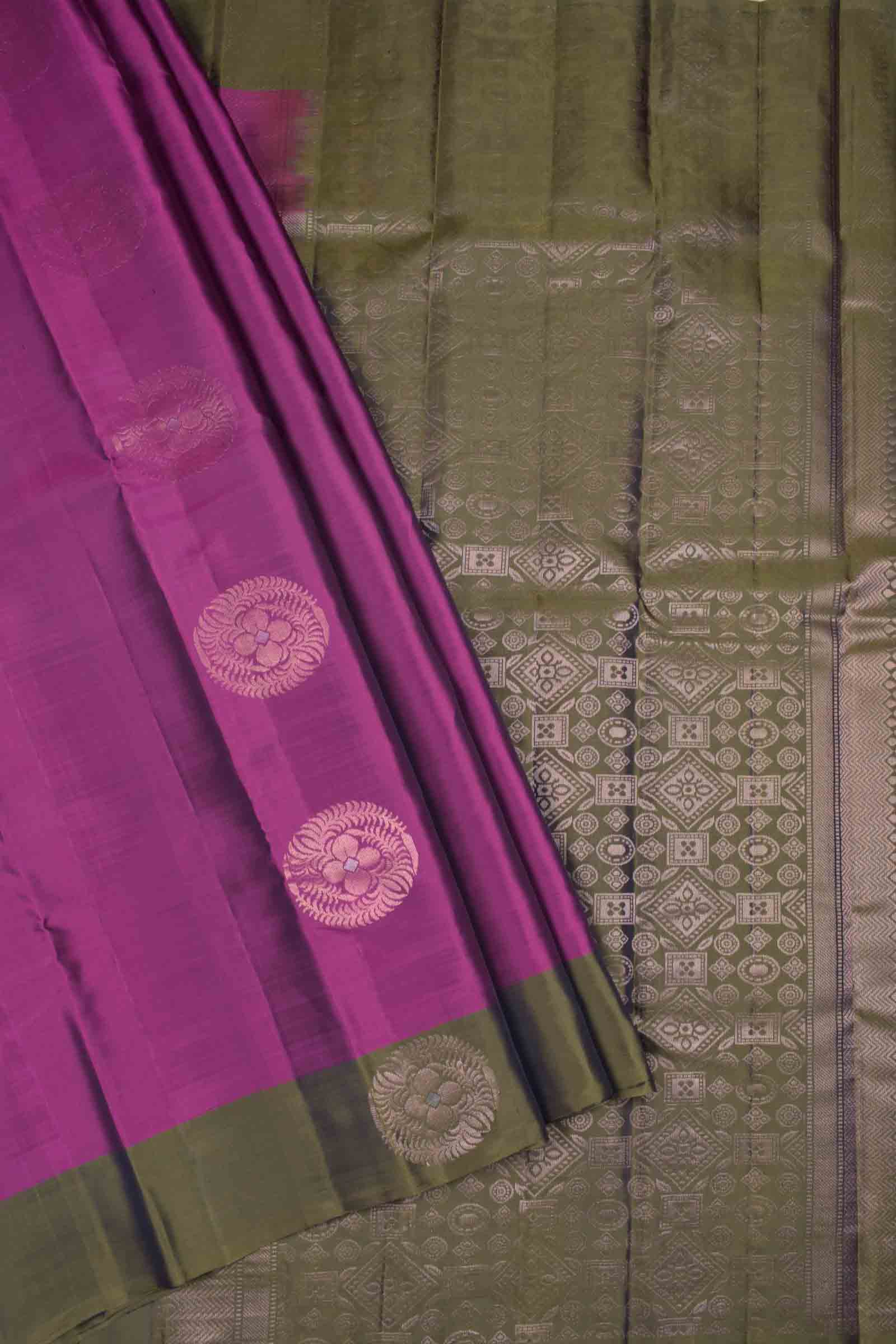 Burgundy Body Fancy Butta Olive Green Border Pallu Semi Soft Silk Saree