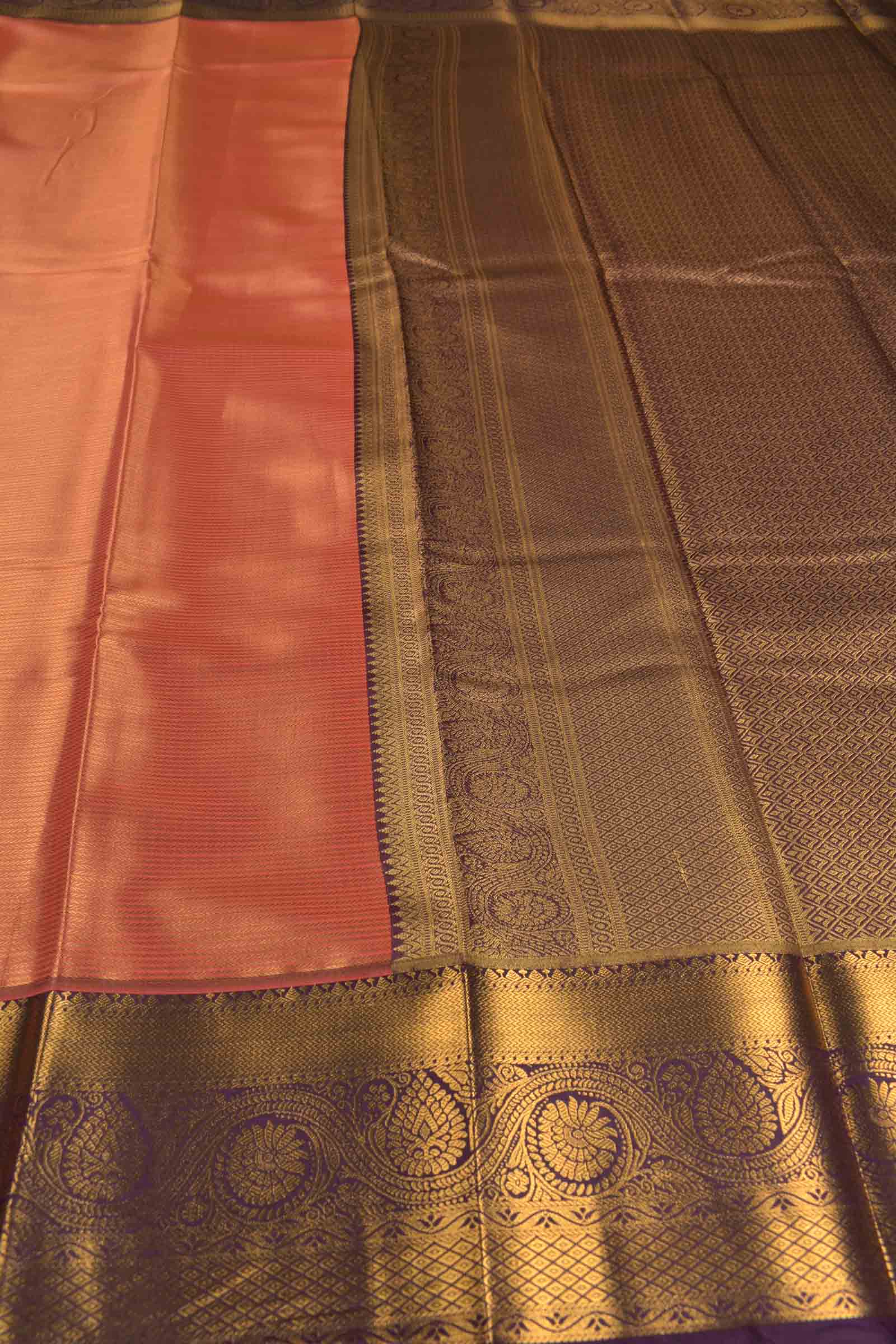Golden Dark Peach Semi Tissue Silk Zari Little Waves Contrast Violet Zari Border Pallu Saree