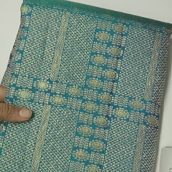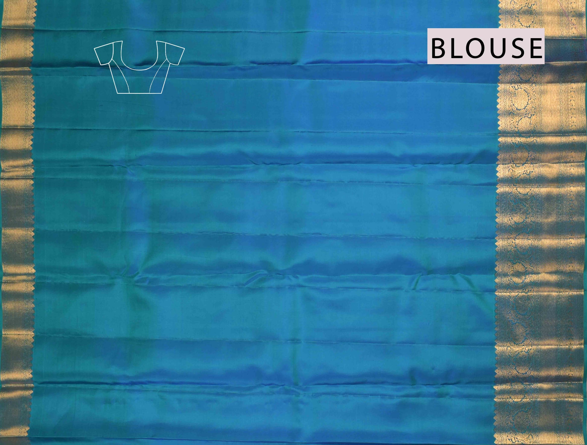 Golden Green Blue Kanchipuram Bridal Pure Silk Golden Zari Border Saree NAA117