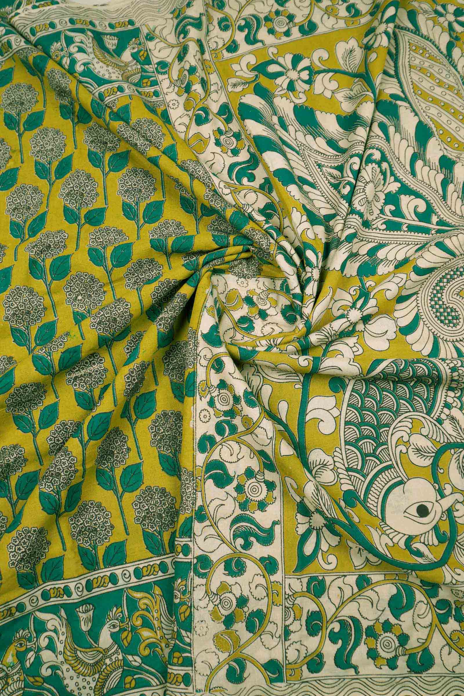 Green Kalamkari Pure Cotton Floral Print Peacock Border Saree