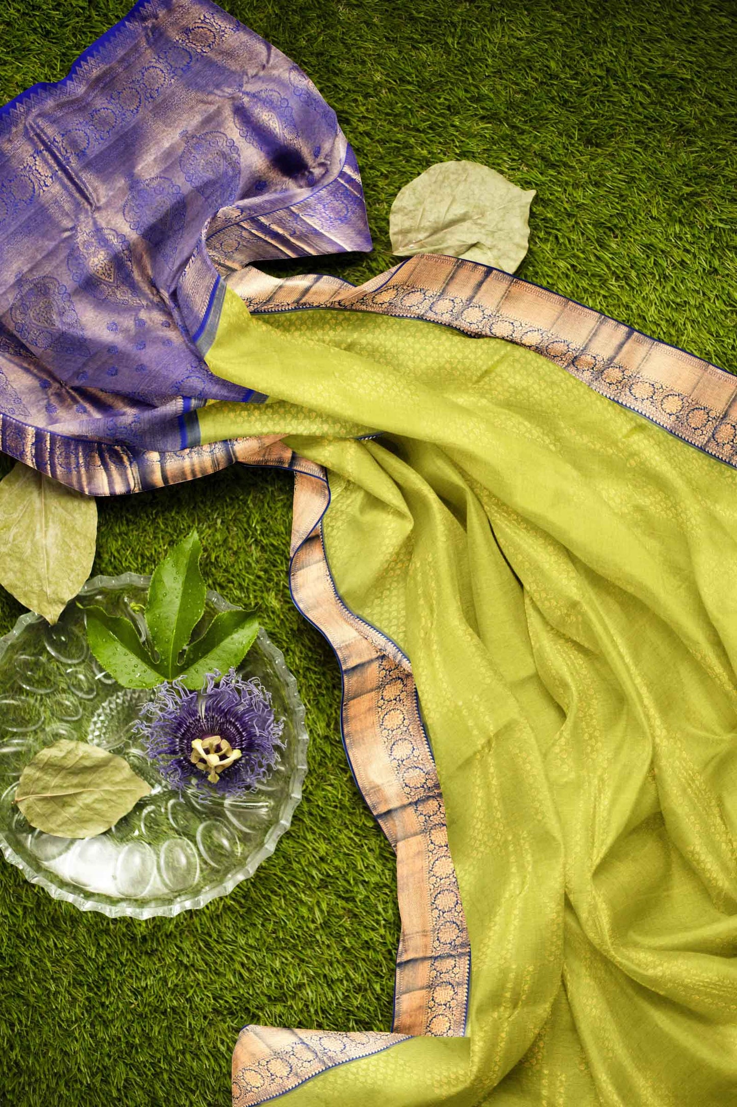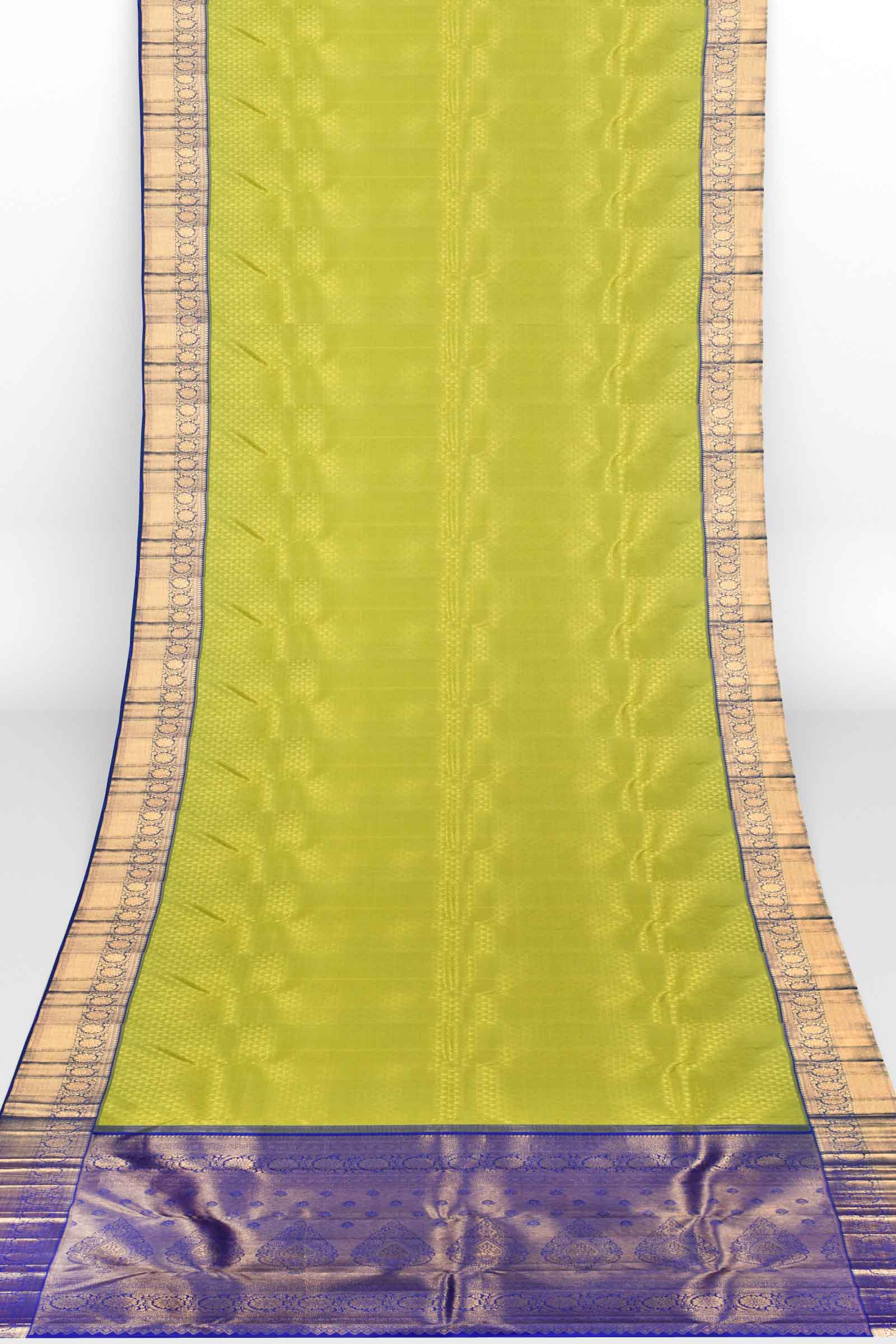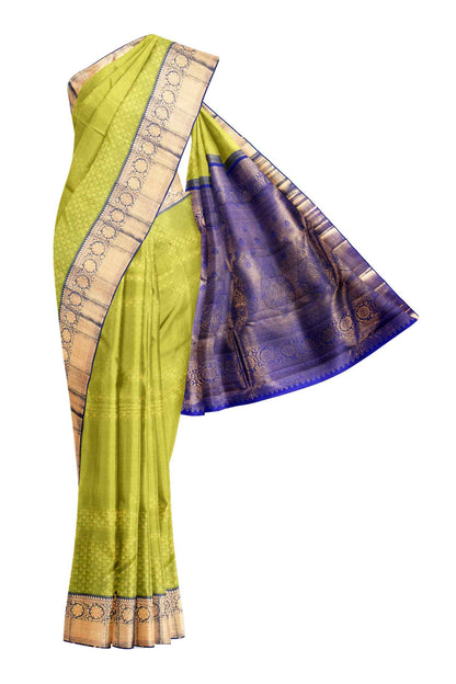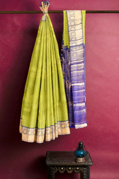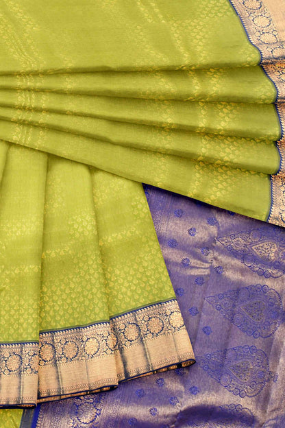 Green Kanchipuram Bridal Pure Silk Small Fern Leaf Butta Body Blue Contrast Pallu Saree