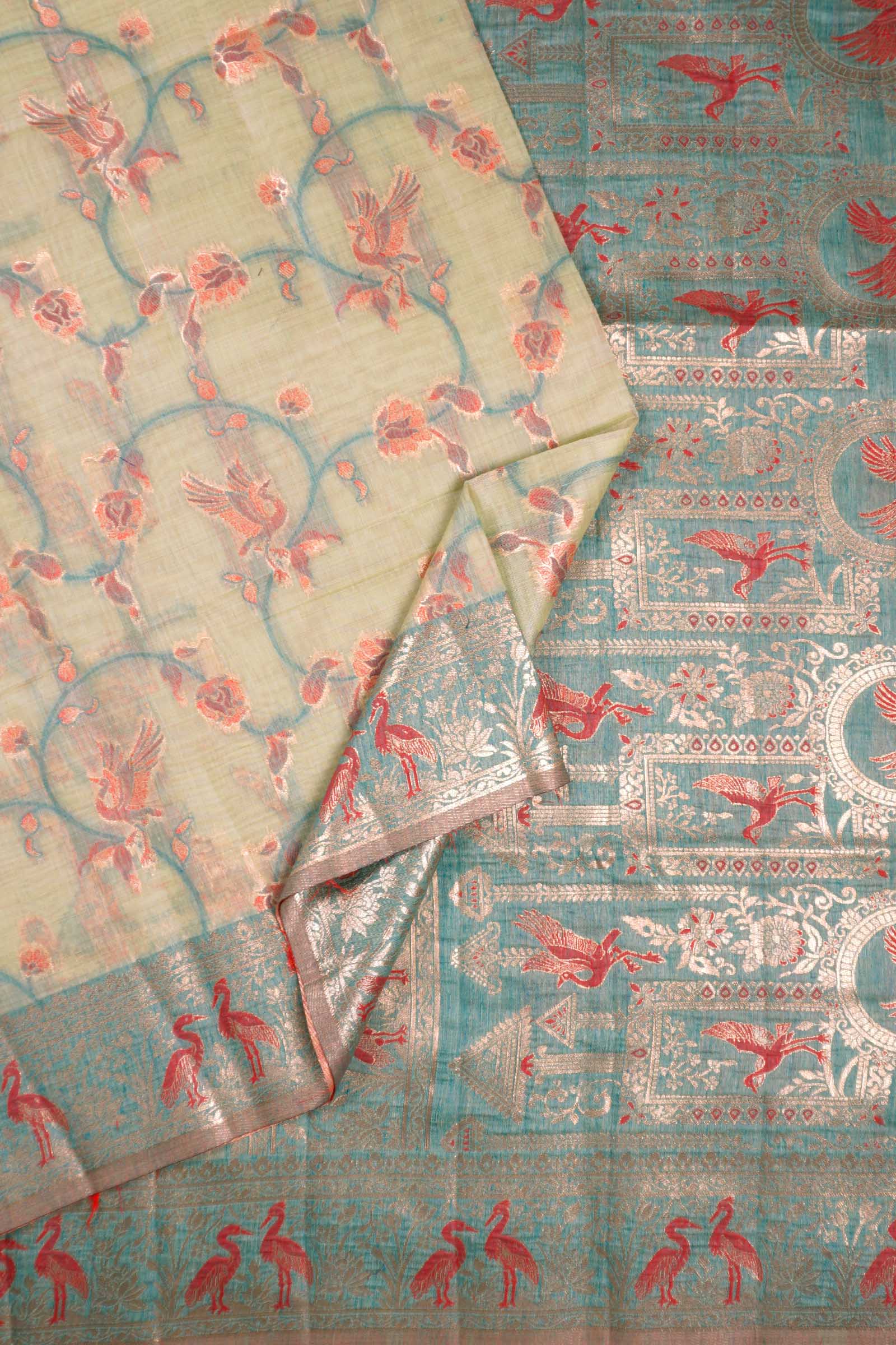 Light Green Soft Bengal Cotton Flying Cranes with Zari Border Saree
