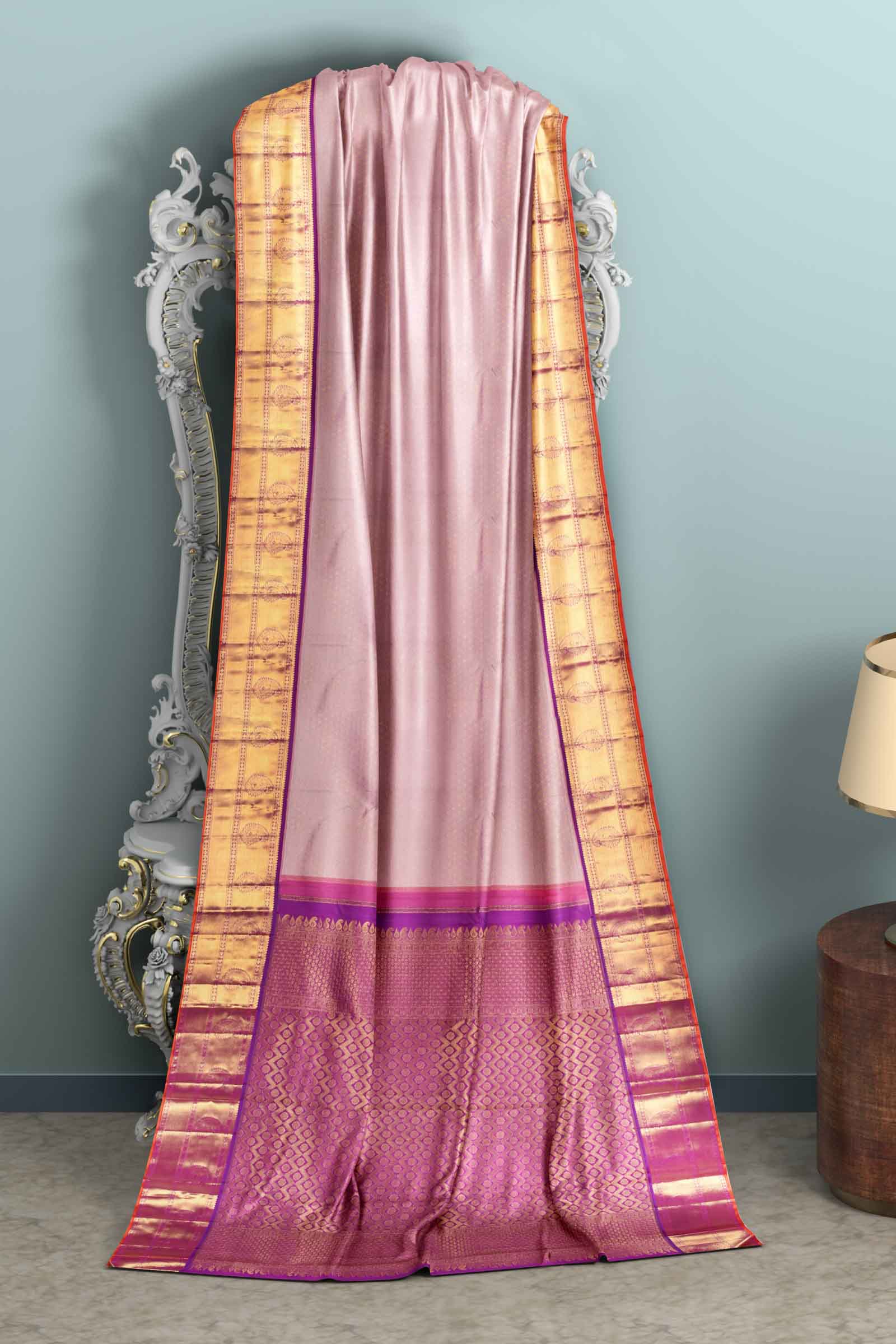 Light Pink Kanchipuram Bridal Pure Silk Small Coin Butta Body Korvai Border Purple Contrast Pallu Saree