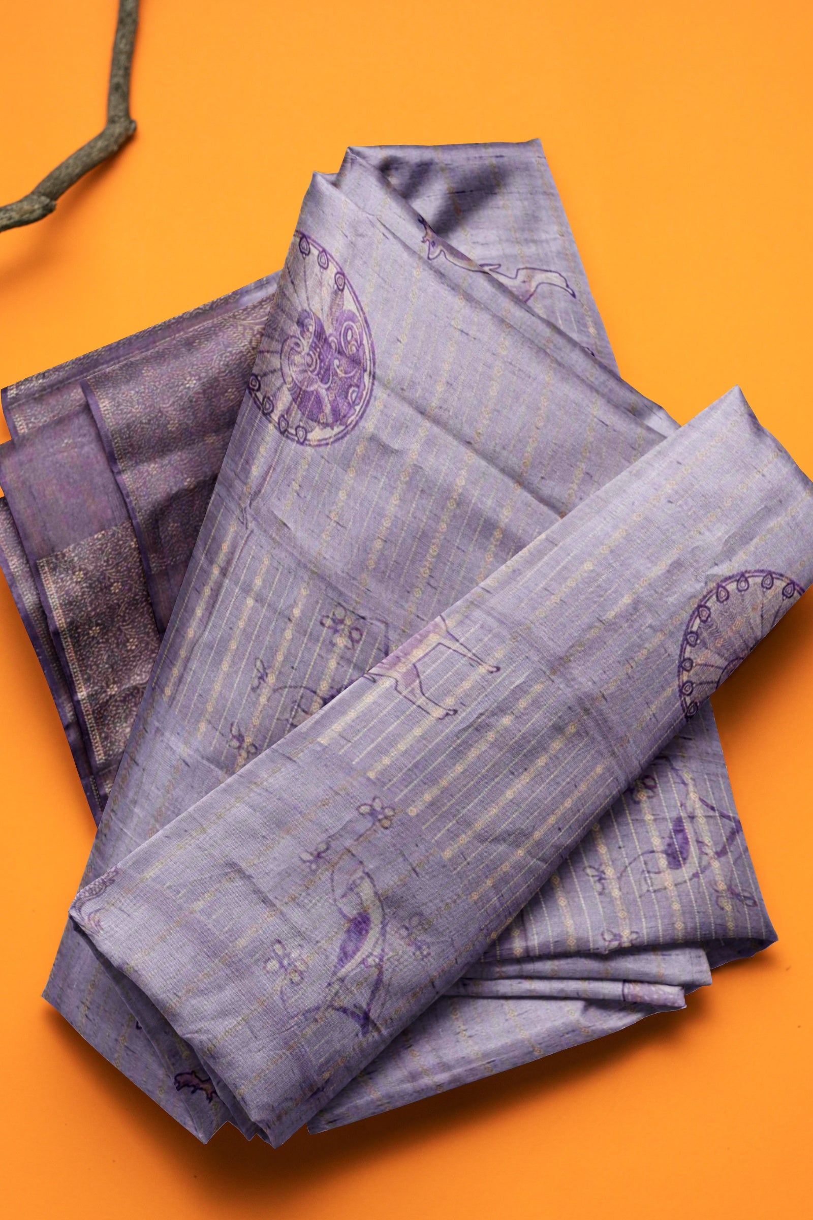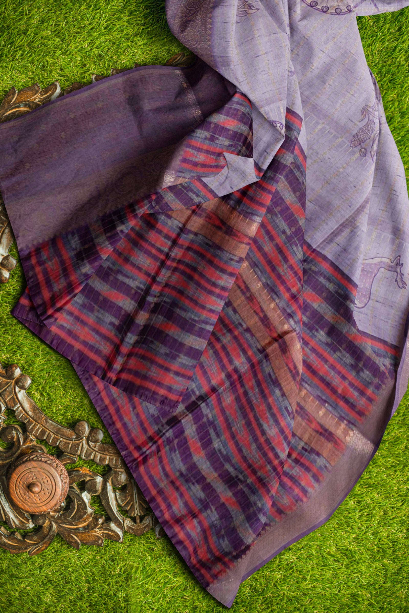 Light Violet Cotton Tropical Forest Print Zari Border Saree