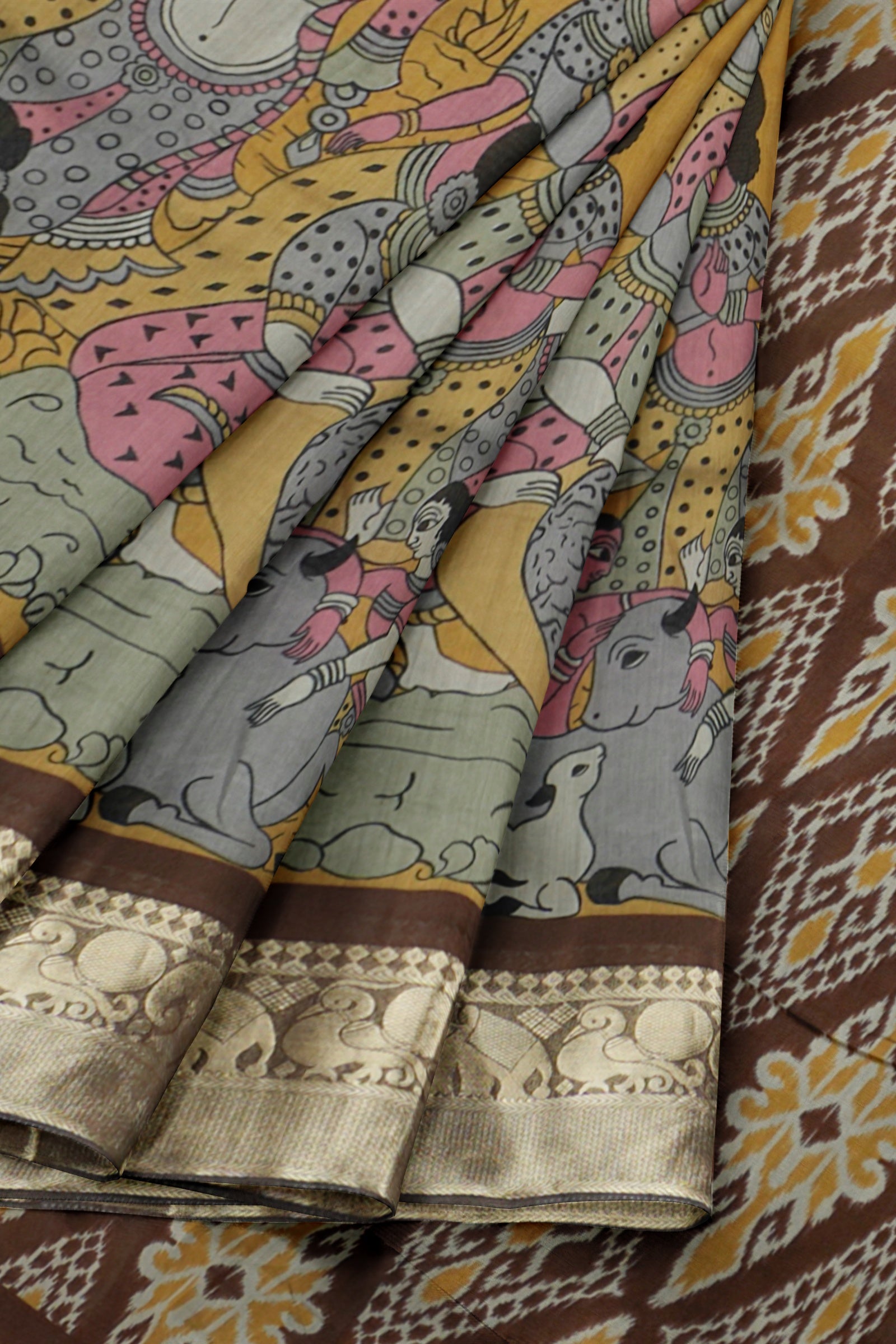 Mustard Yellow Epic Tales Printed Cotton Zari Border Saree