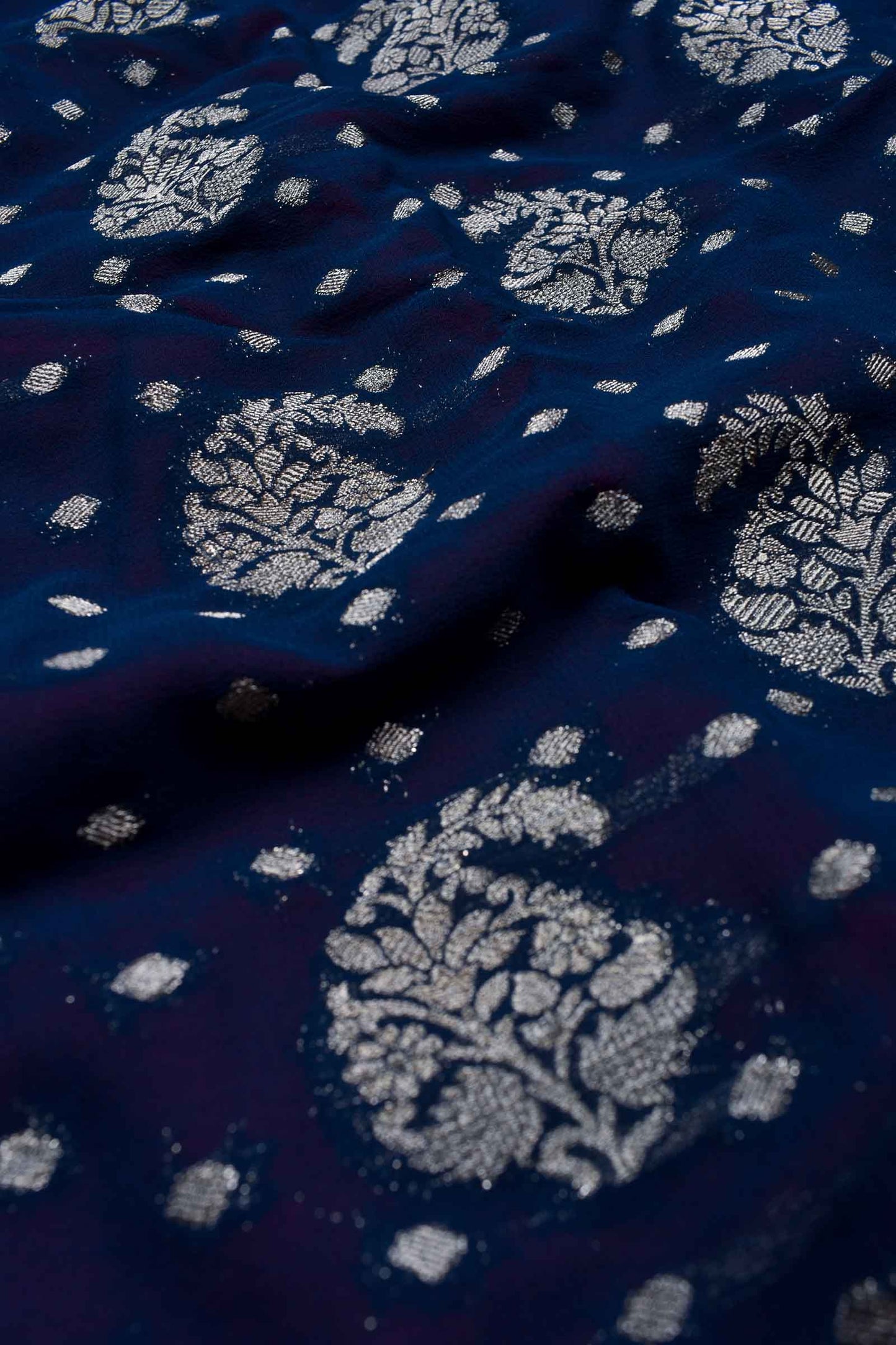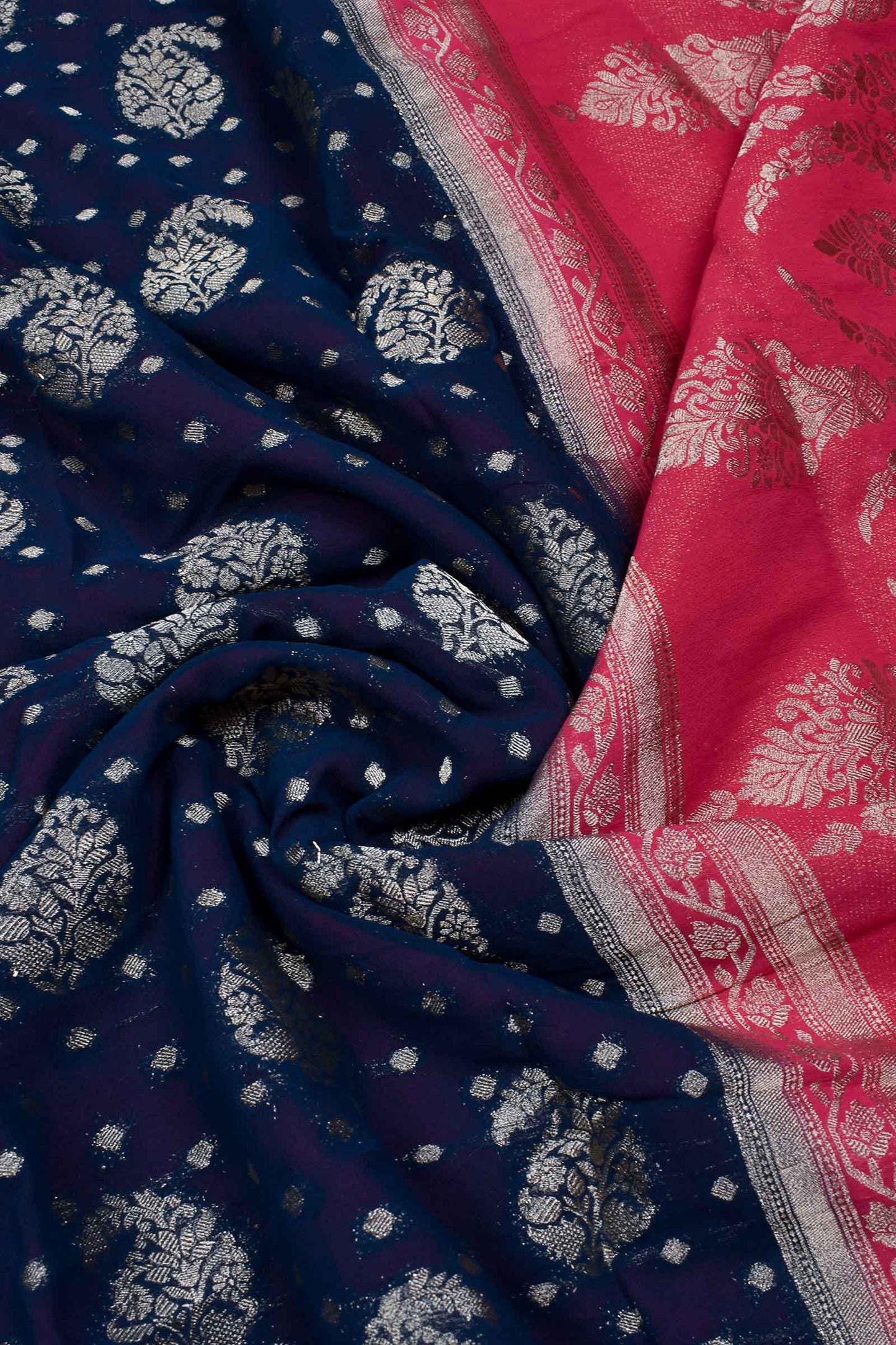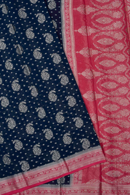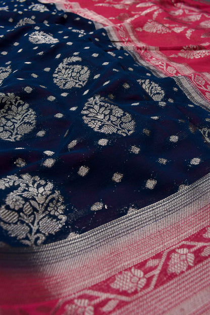 Navy Blue Georgette Mango Butta Contrast Pink Pallu Saree