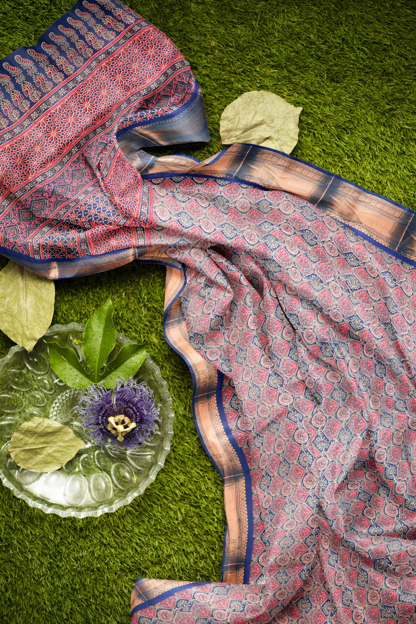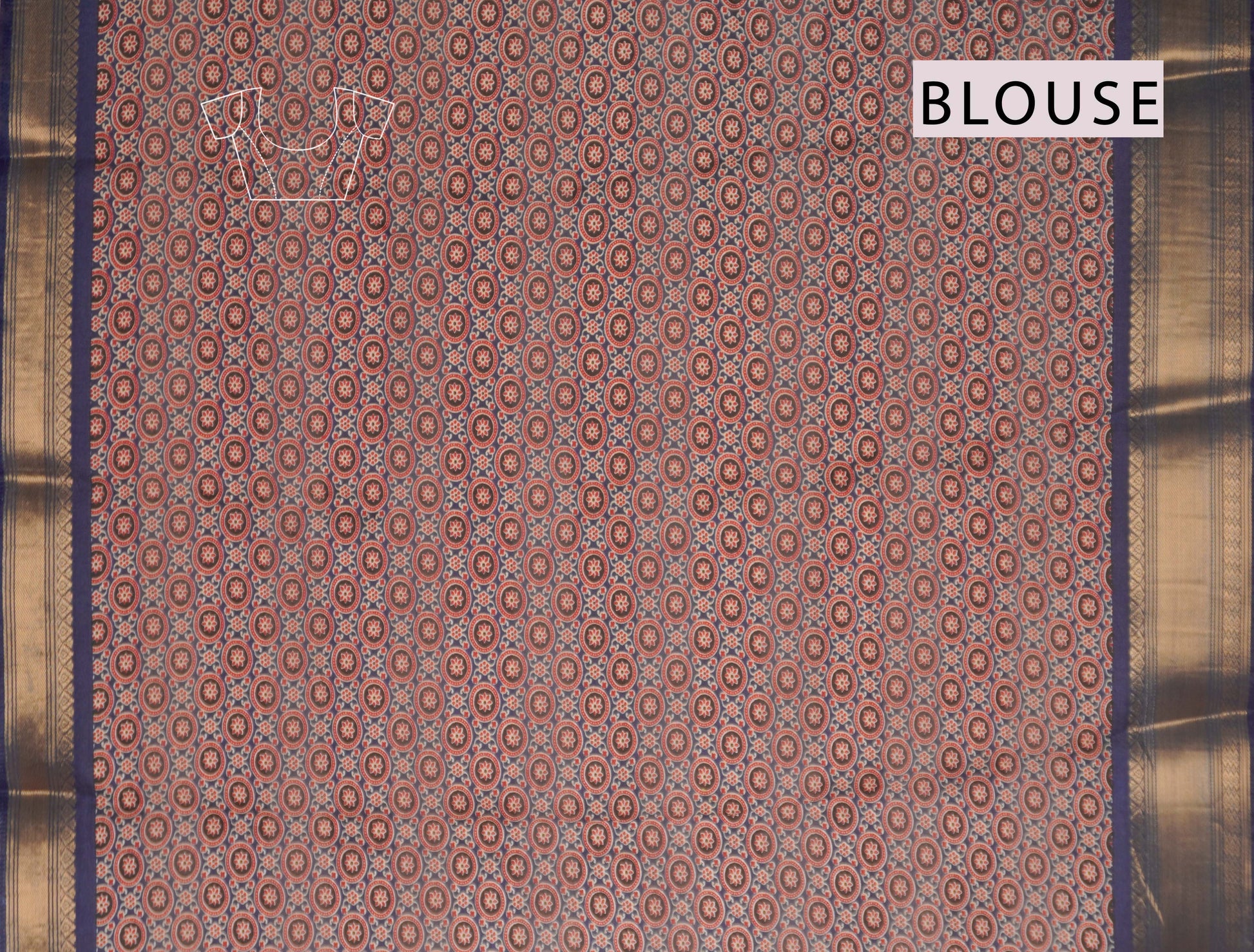 Navy Blue Printed Cotton Ajrakh Style Print Zari Border Saree