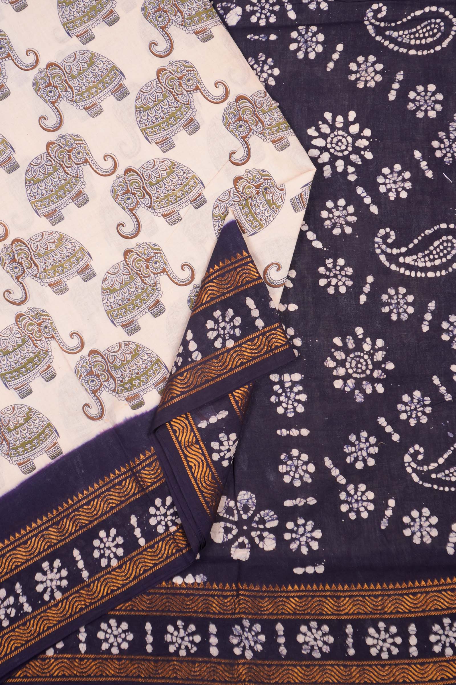 Off White Pure Sungudi Cotton Elephant Parade Zari Border Saree NAA244