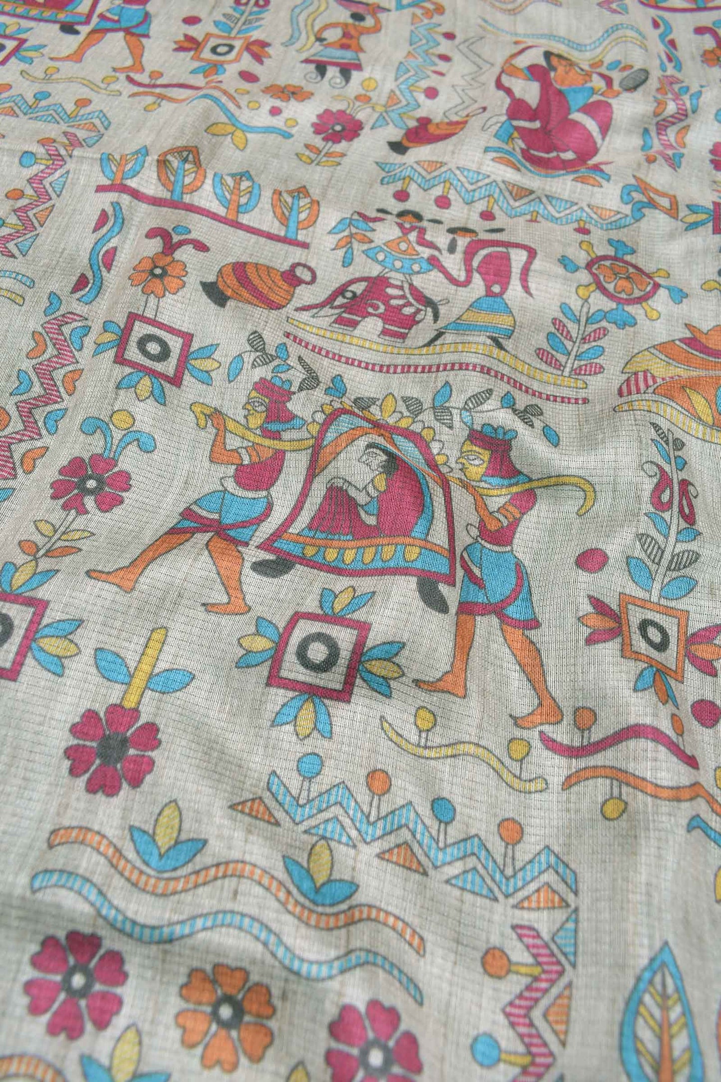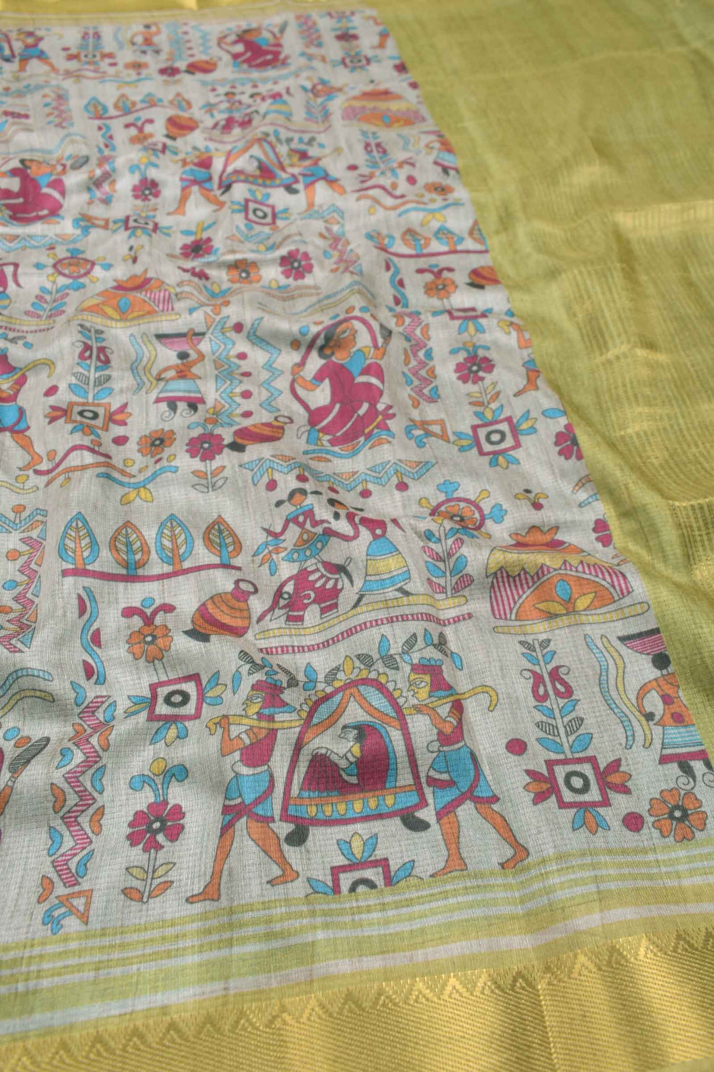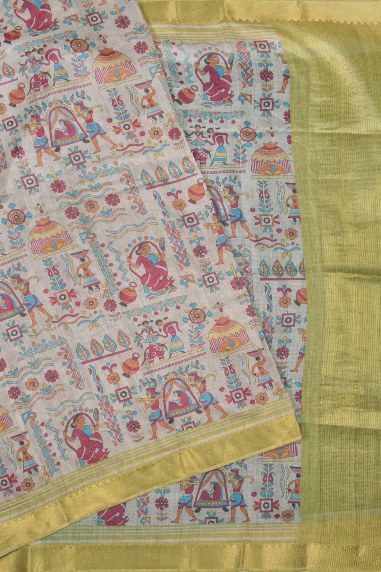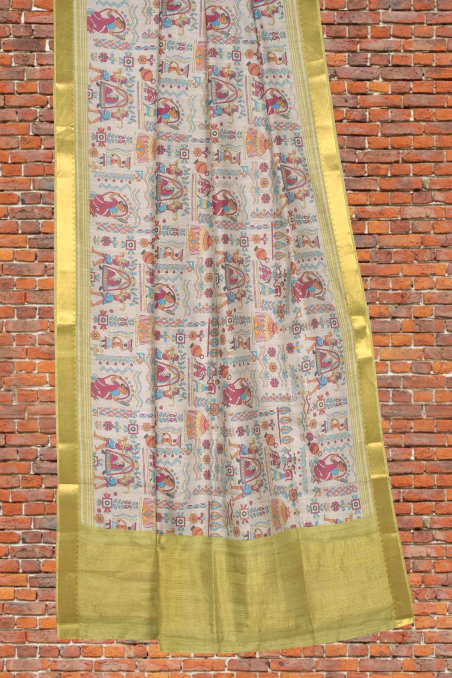 Off White Semi Tussar Fancy Design Printed Golden Zari Border Zari Lines Pallu Saree