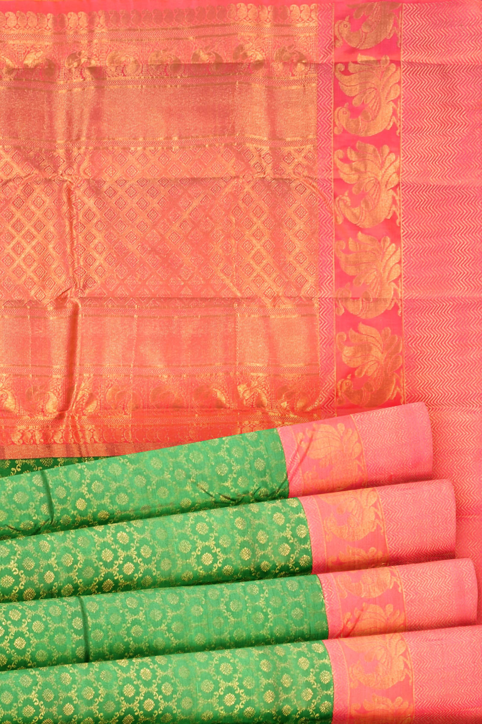 Green Kanchipuram Bridal Pure Silk Rudraksh Butta Body Fancy Peacock Border Pink Contrast Pallu Saree