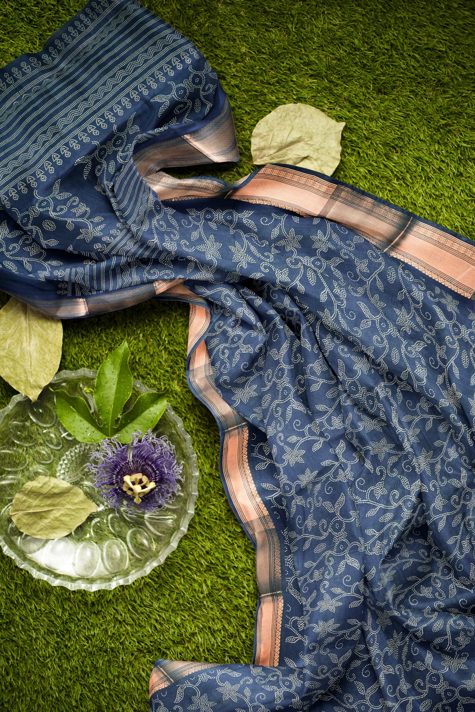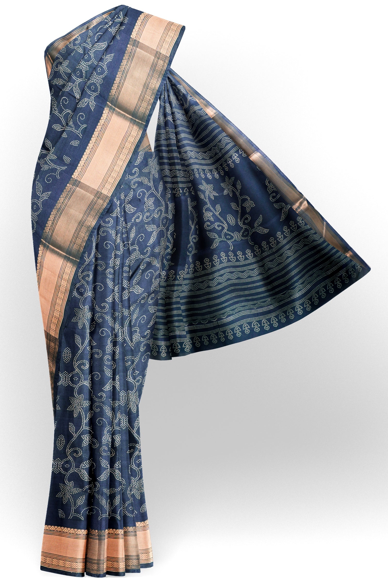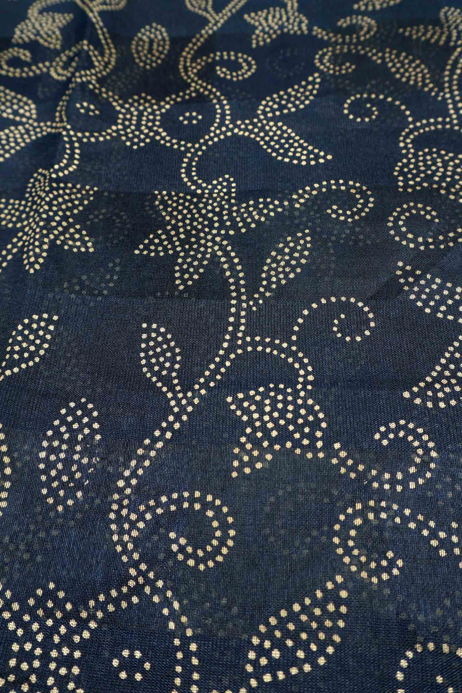 Royal Blue Printed Cotton Dot Florals Zari Border Saree