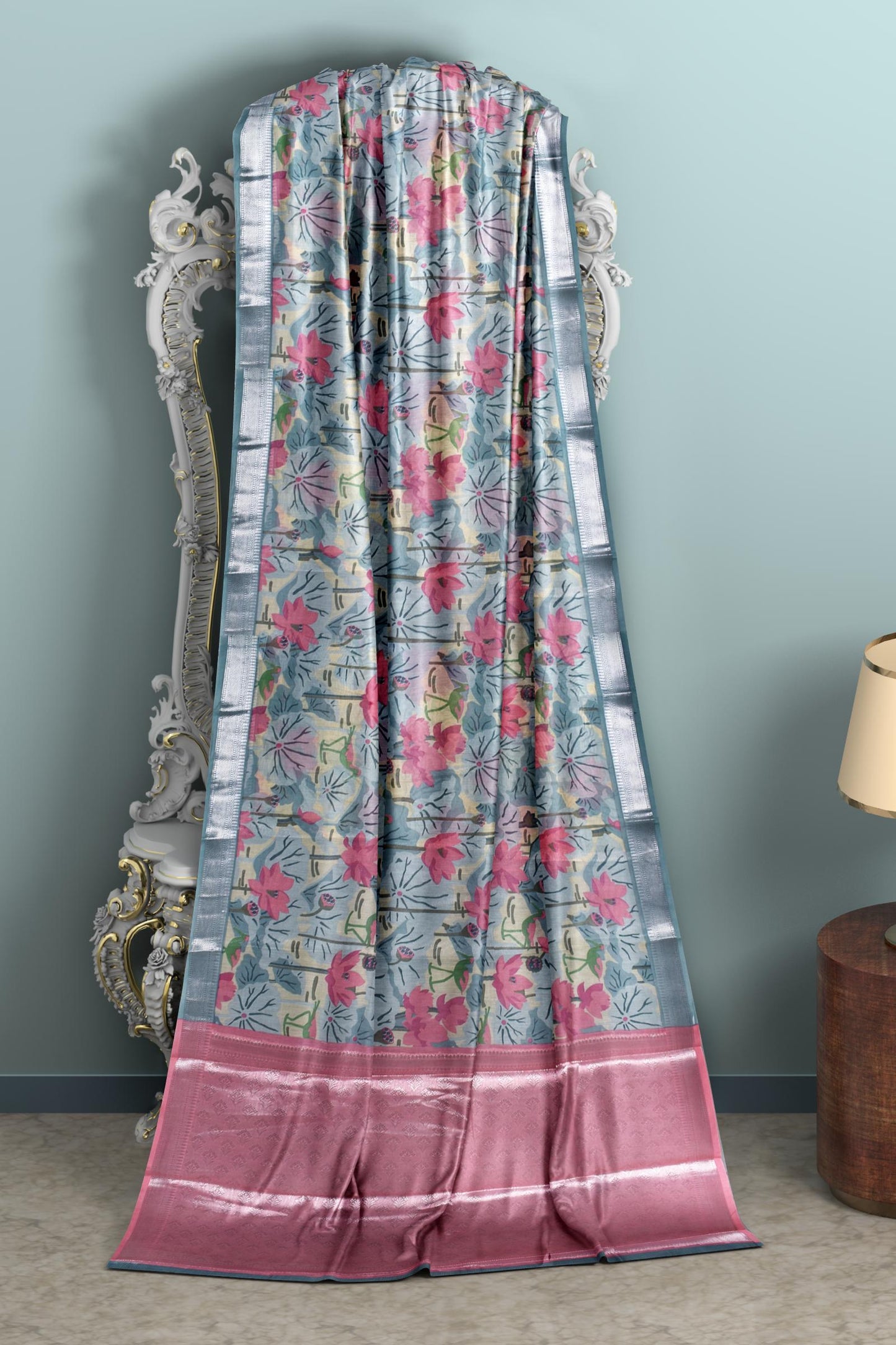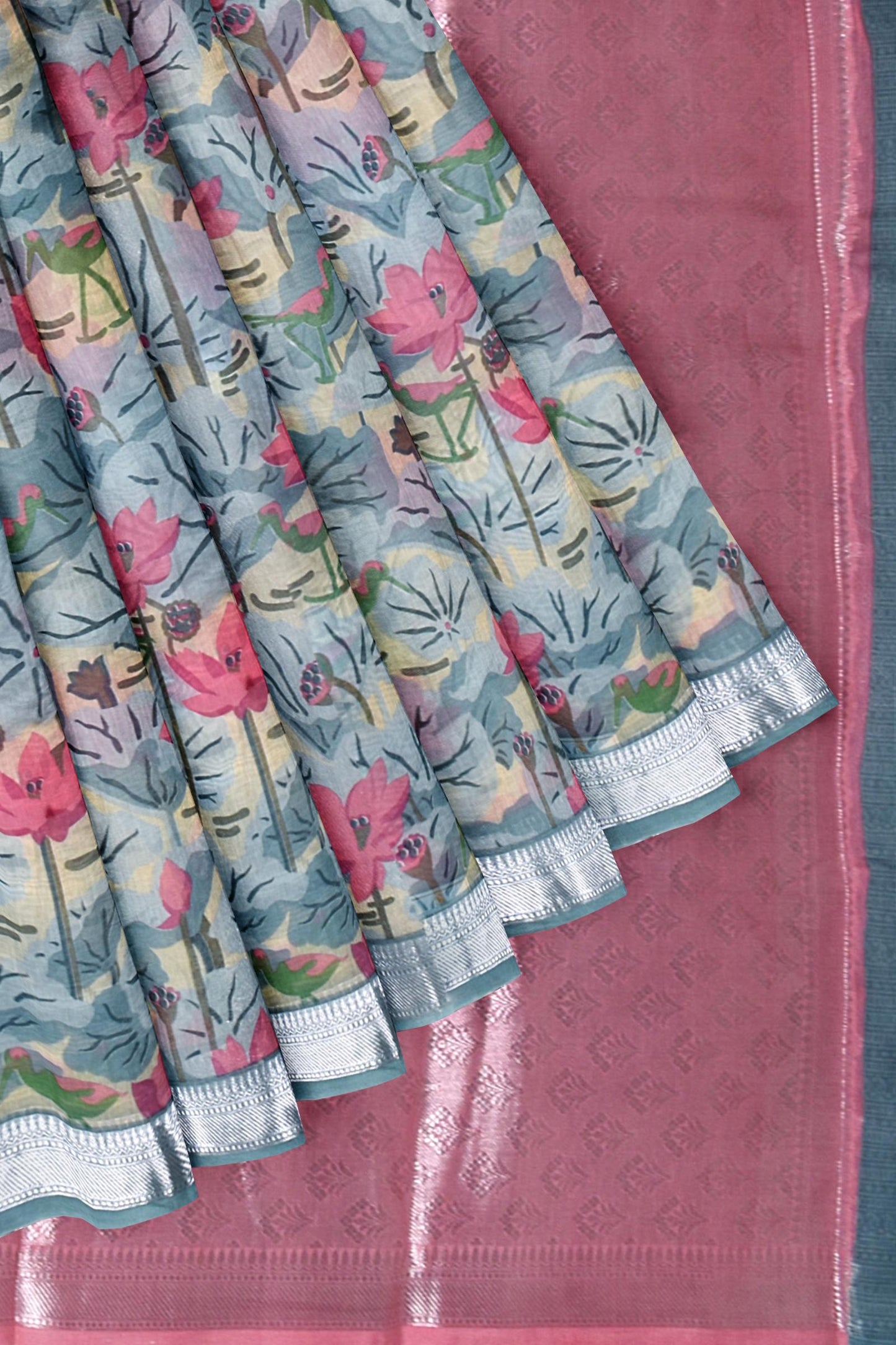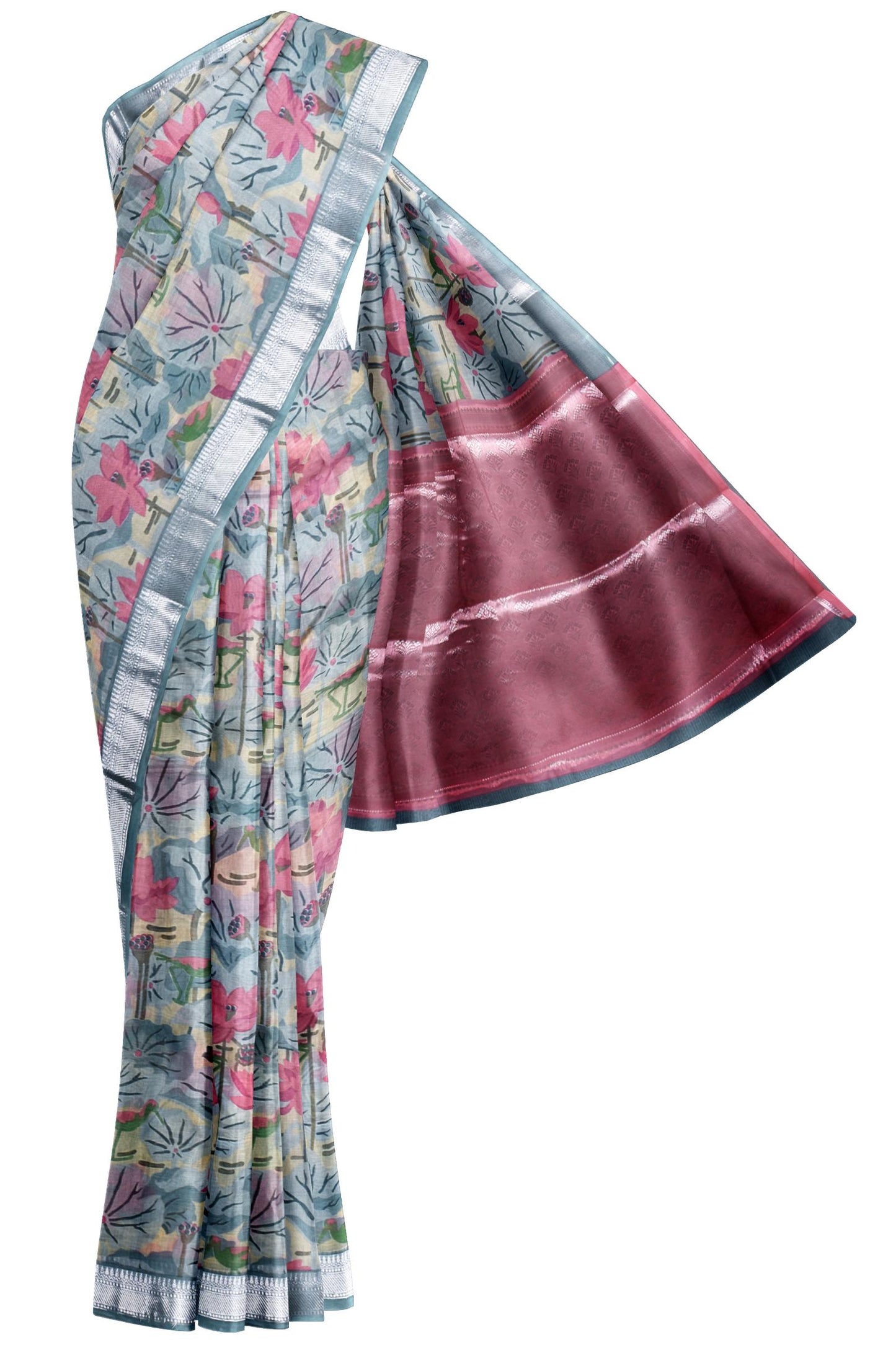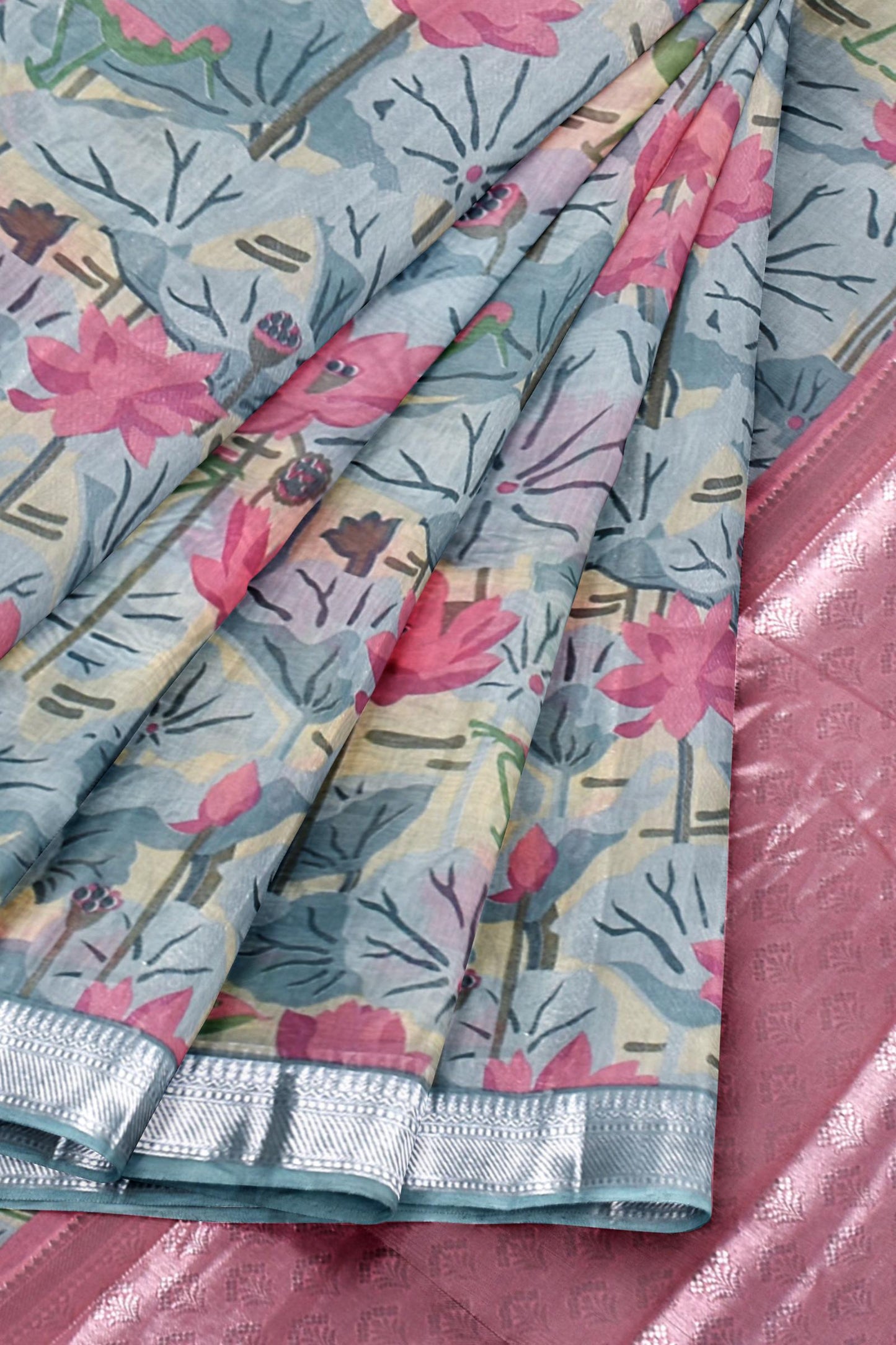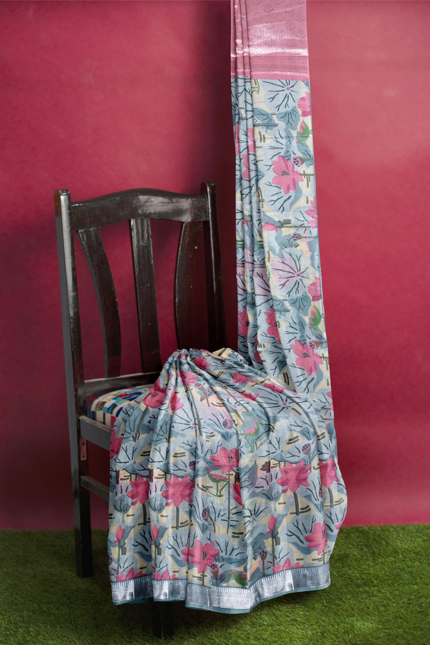 Light Blue Chanderi Silk Cotton Floral Printed Silver Border Saree