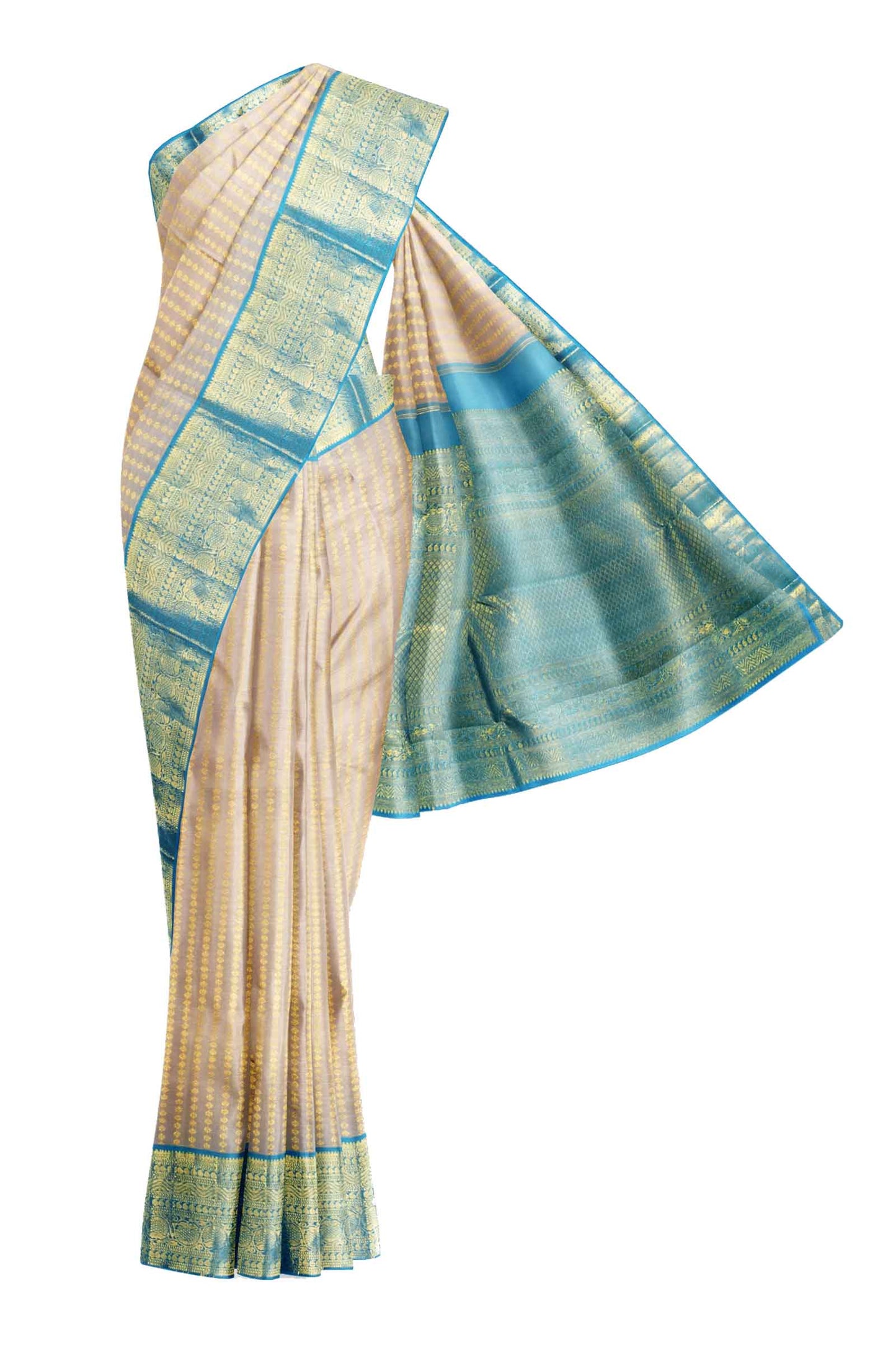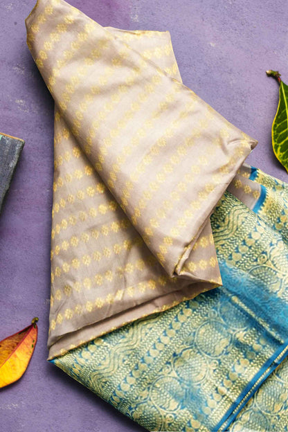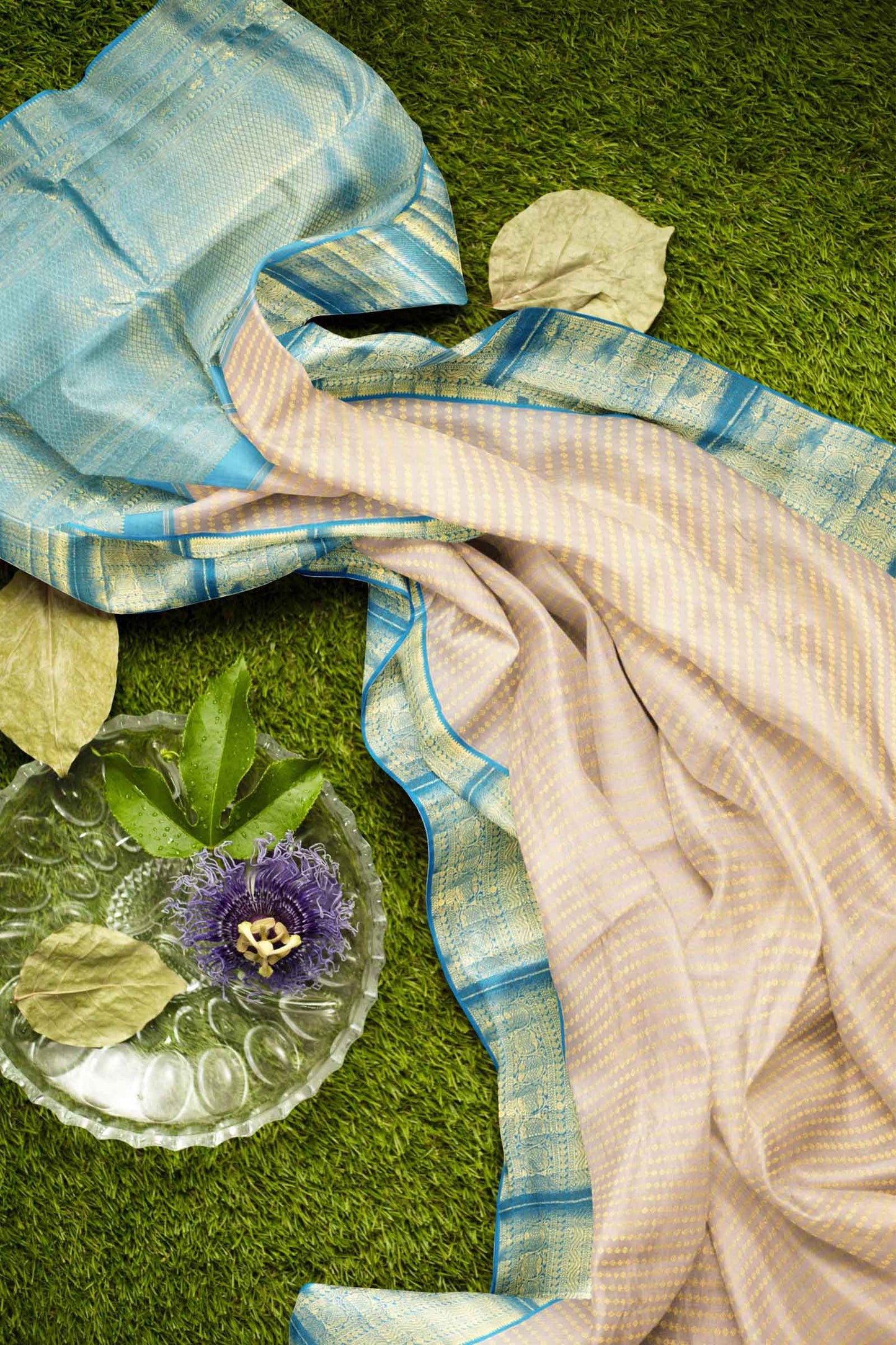 Light Grey Kanchipuram Bridal Pure Silk Mini Flower Butta Korvai Border Blue Contrast Pallu Saree