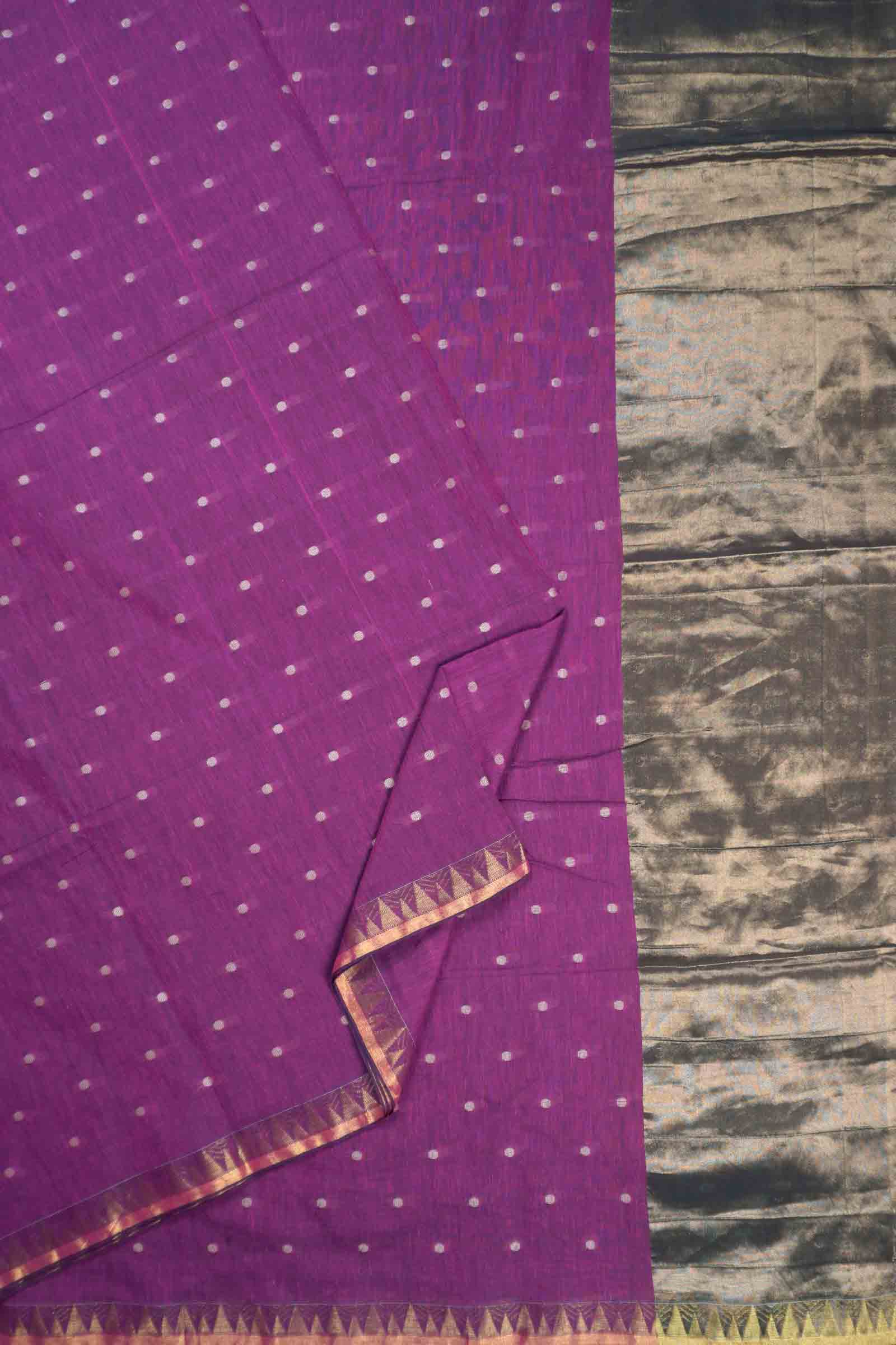 VioletSoft Bengal Cotton Mini Polka Butta Block Zari Pallu Saree