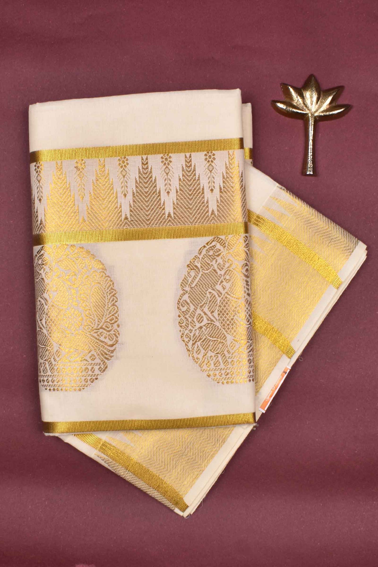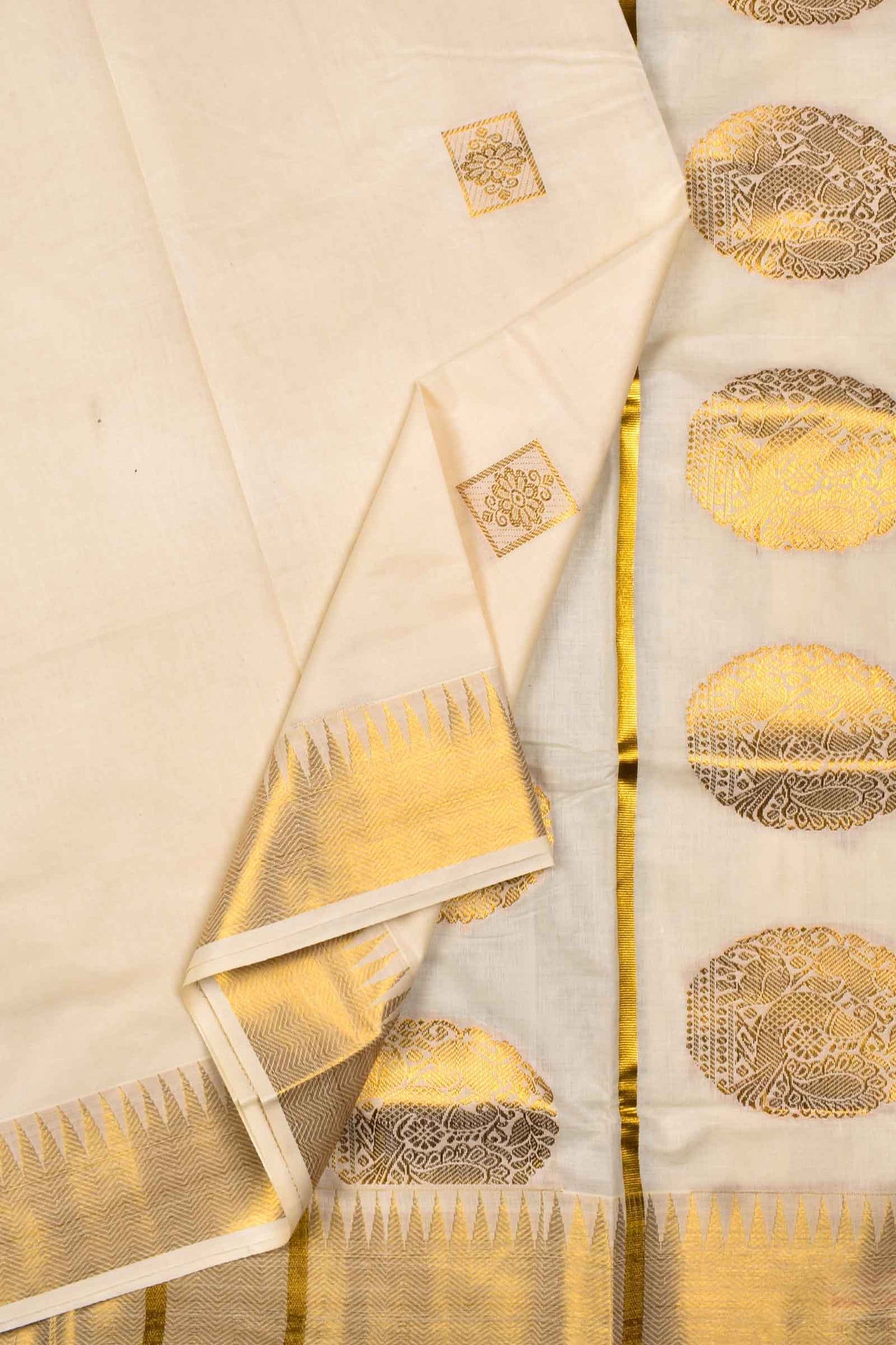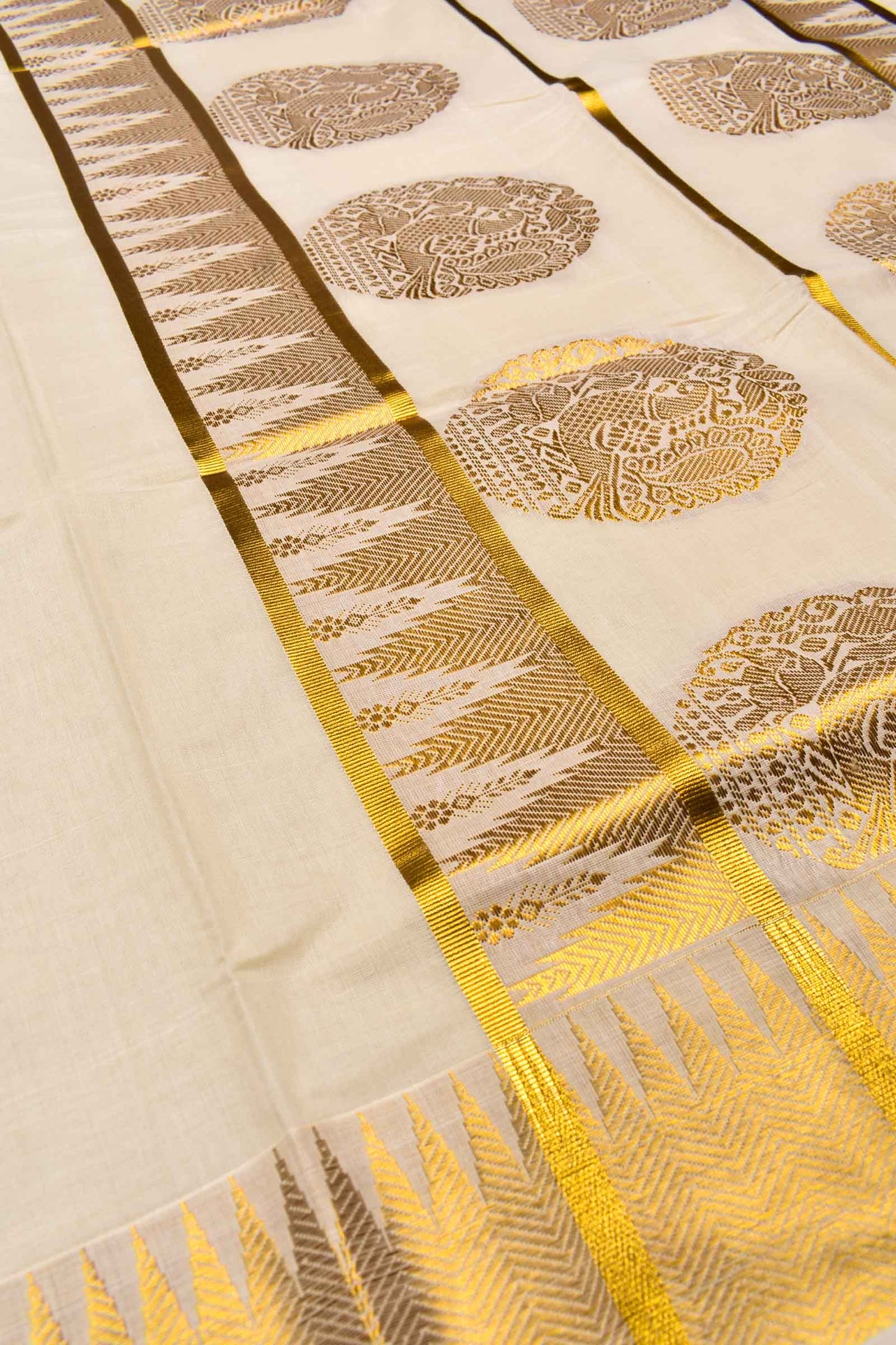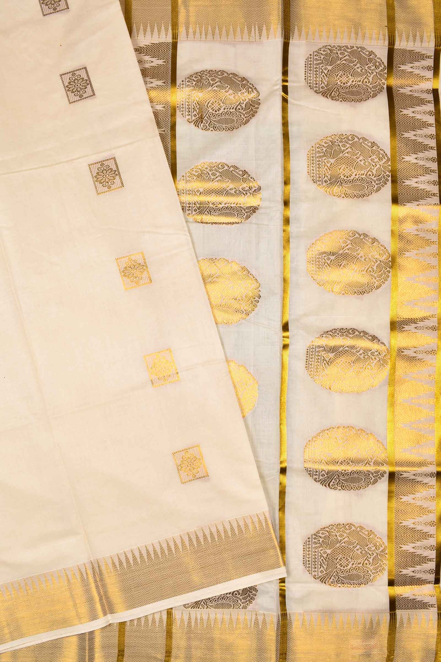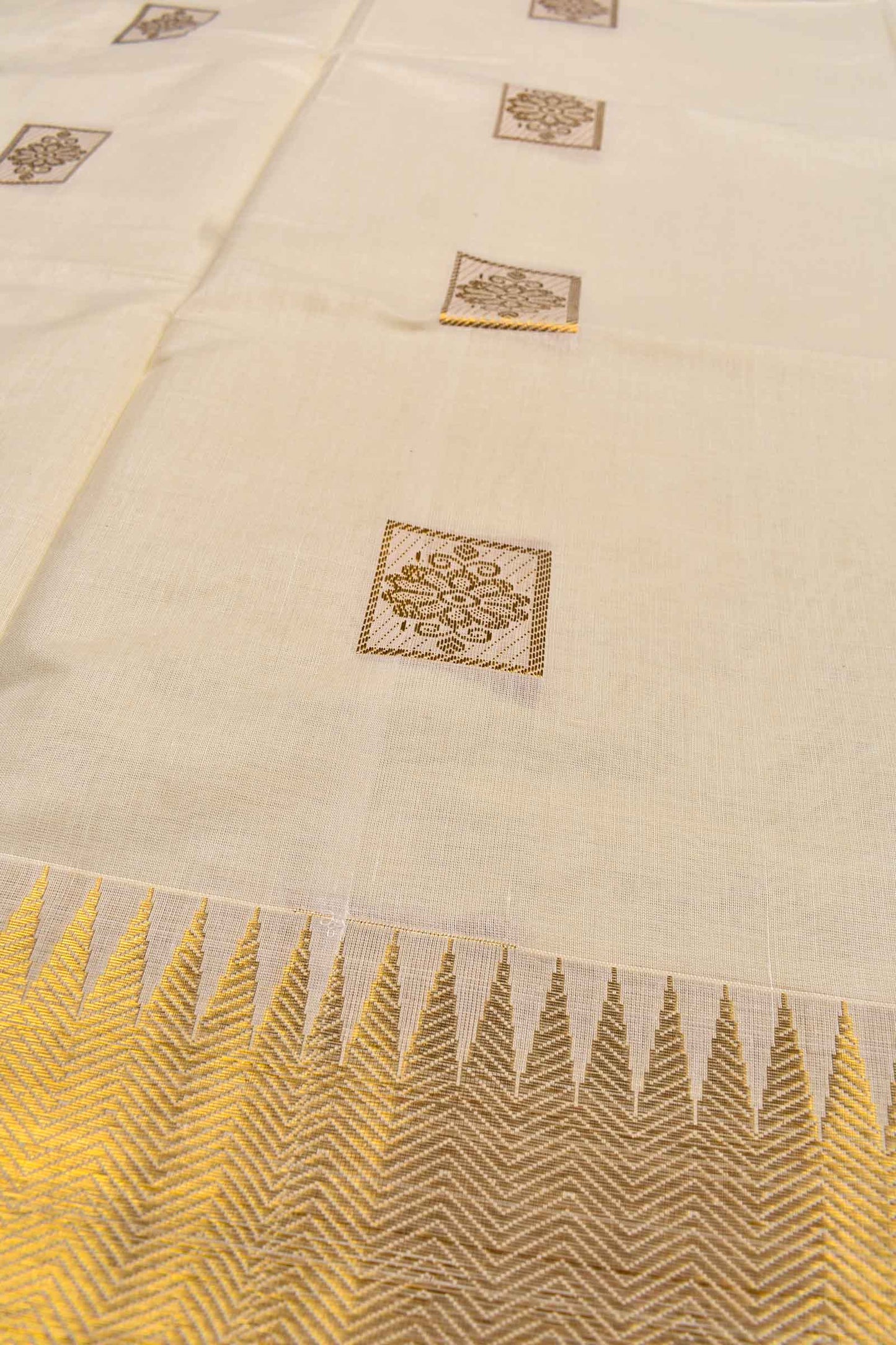 Off White Kerala Cotton Square Design Butta Temple Border Rich Pallu Saree