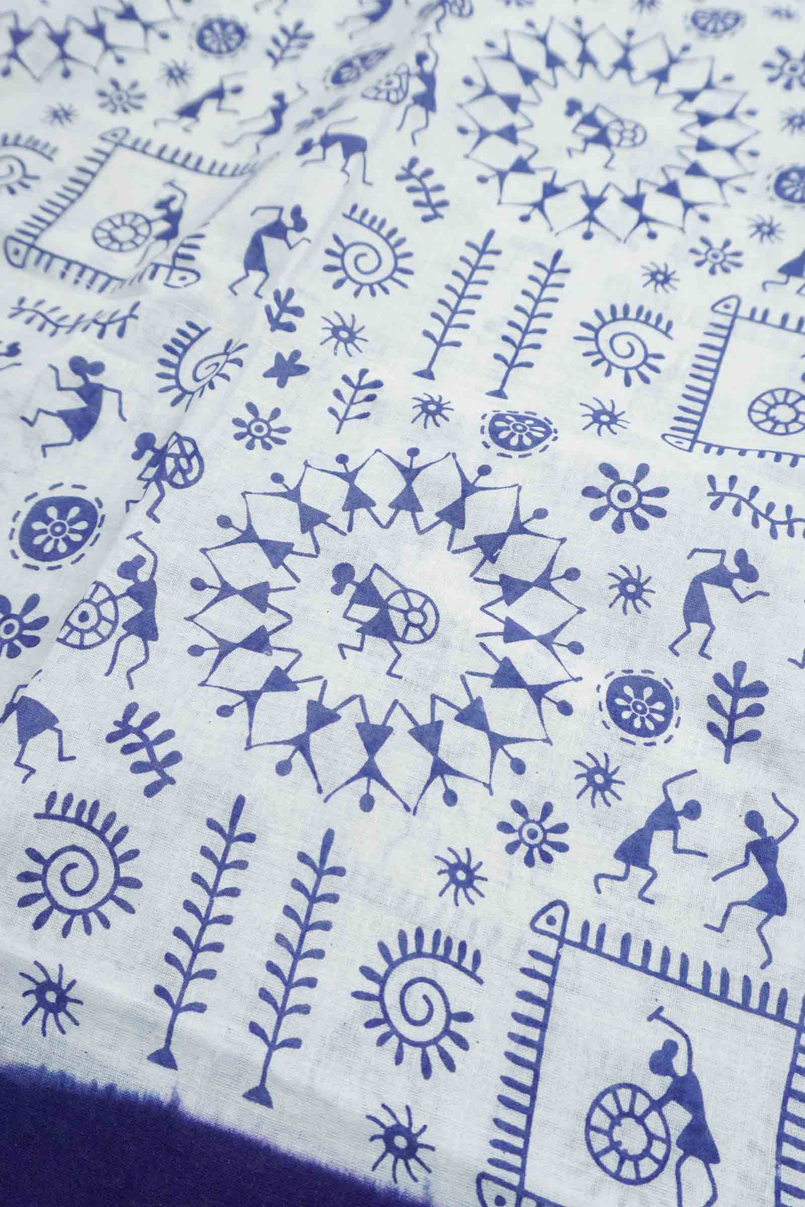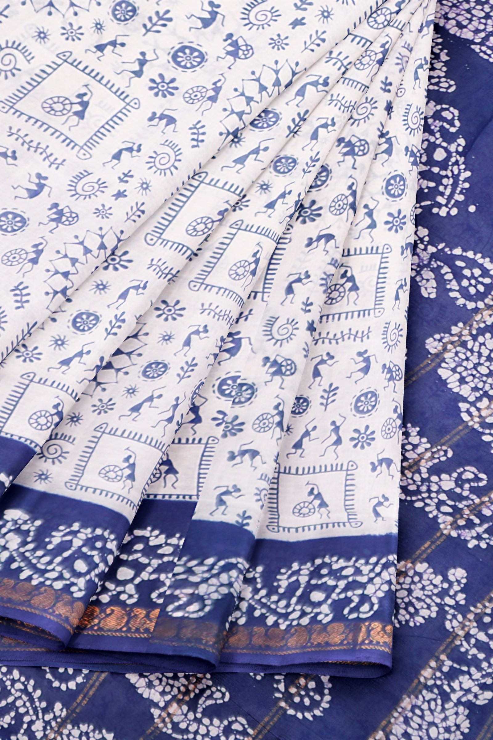 White Pure Sungudi Cotton Warli Print Zari Peacock Border Saree